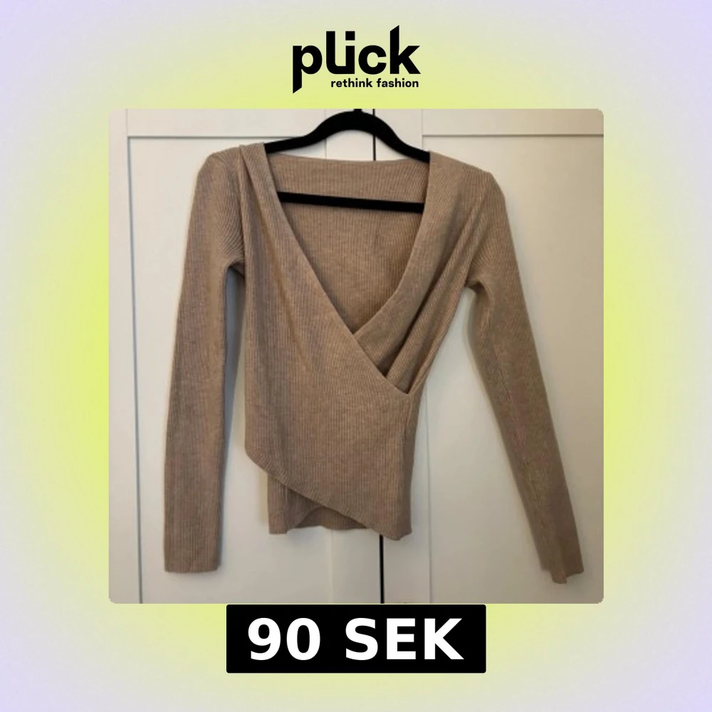 Säljer en beige ribbad omlottopp med lång ärm. Toppen har en djup v-ringning och omlottdesign framtill som ger en snygg och trendig look. Aldrig använd