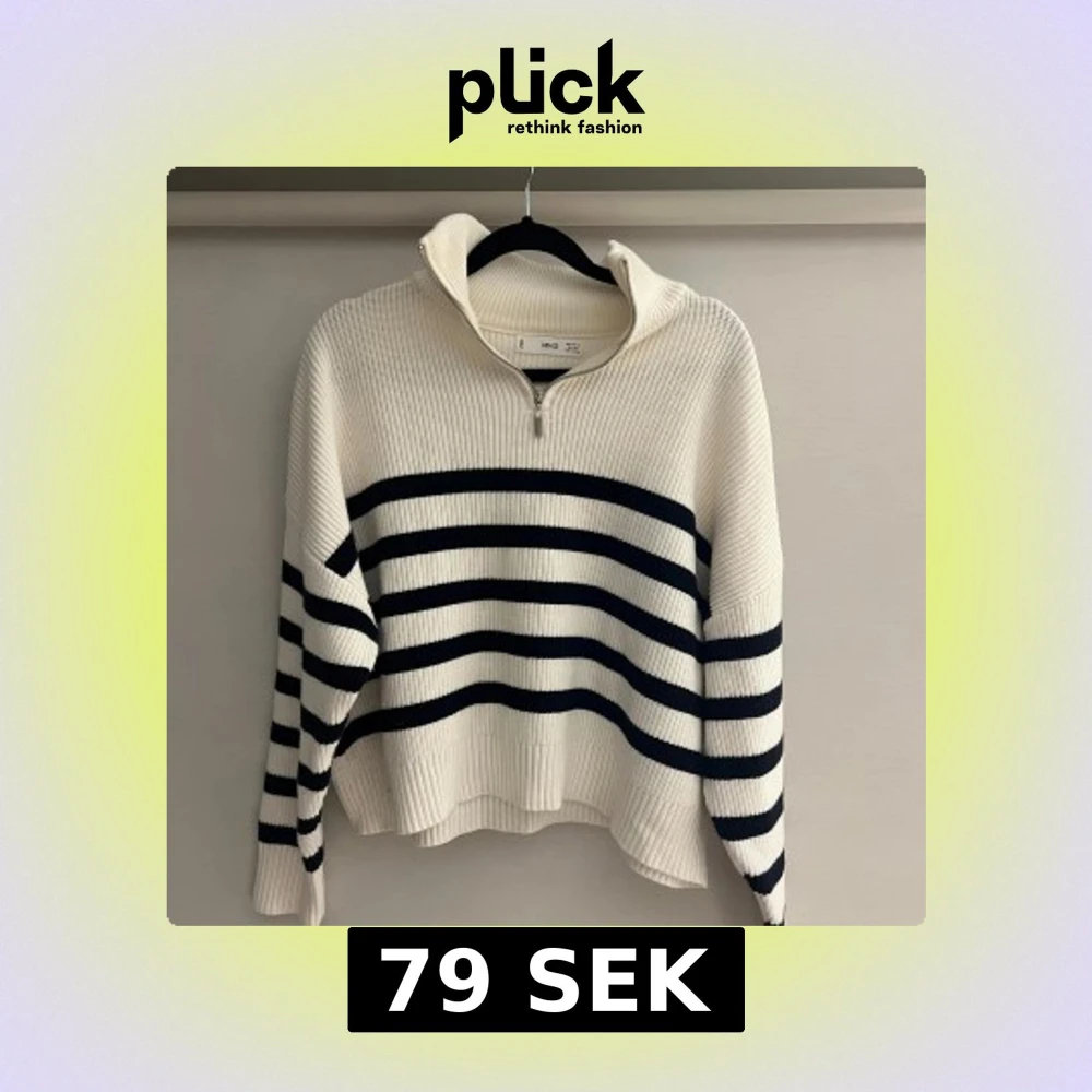 Säljer en ribbstickad tröja från MNG i vitt med svarta horisontella ränder. Tröjan har hög krage och half zip-dragkedja framtill. Långärmad och i en lite loose passform, perfekt för lager på lager. Materialet är mjukt och känns riktigt cozy.