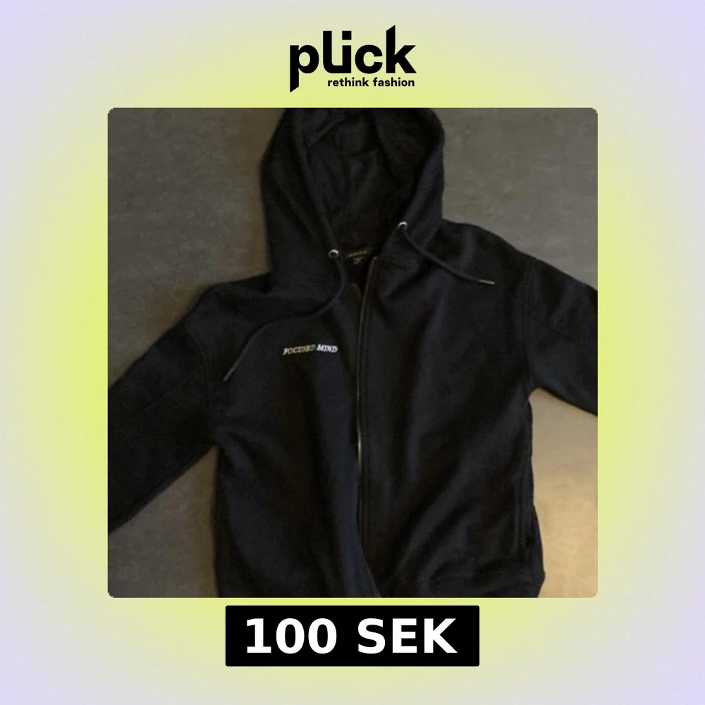 Säljer en svart hoodie från Amisu med texten 'FOCUSED MIND' broderad på bröstet. Den har en dragkedja framtill och en bekväm huva med snörning. Perfekt för en avslappnad stil.