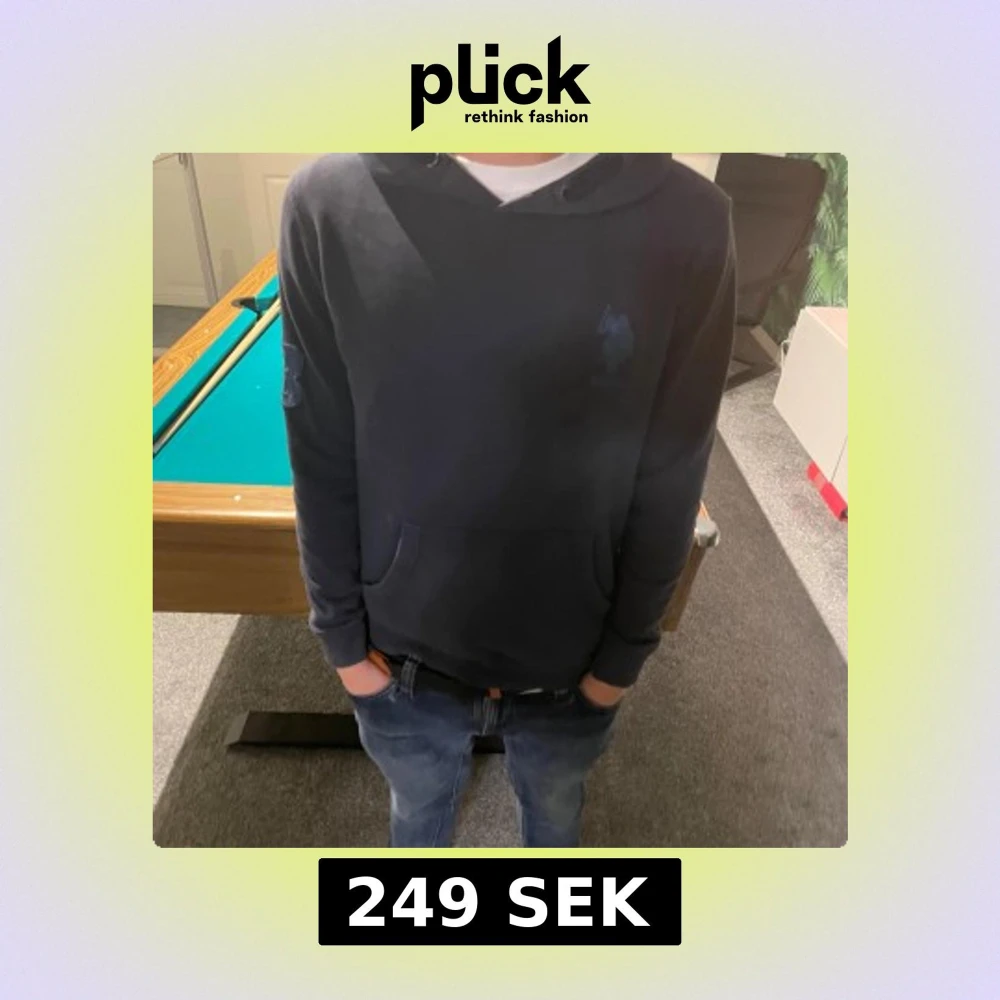 Säljer en mörkblå hoodie från USPA med broderad logga på bröstet. Tröjan har huva, känguruficka och långa ärmar. Skön passform och klassisk stil, perfekt till jeans eller joggers.