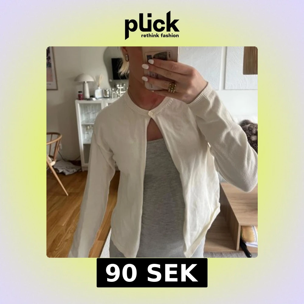 Säljer en stilren vit kofta med rund halsringning och en enkel knapp högst upp. Koftan är långärmad och har en mjuk, tunn känsla som passar perfekt över ett linne eller t-shirt. Enkel och clean design som funkar till många outfits.