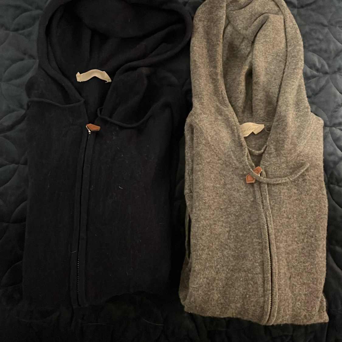Två hoodies från Sayless i svart och grått. Båda har dragkedja och huva, perfekta för en avslappnad stil. De är tillverkade i ett mjukt material som ger komfort och värme. 399 styck eller 699 för båda 2