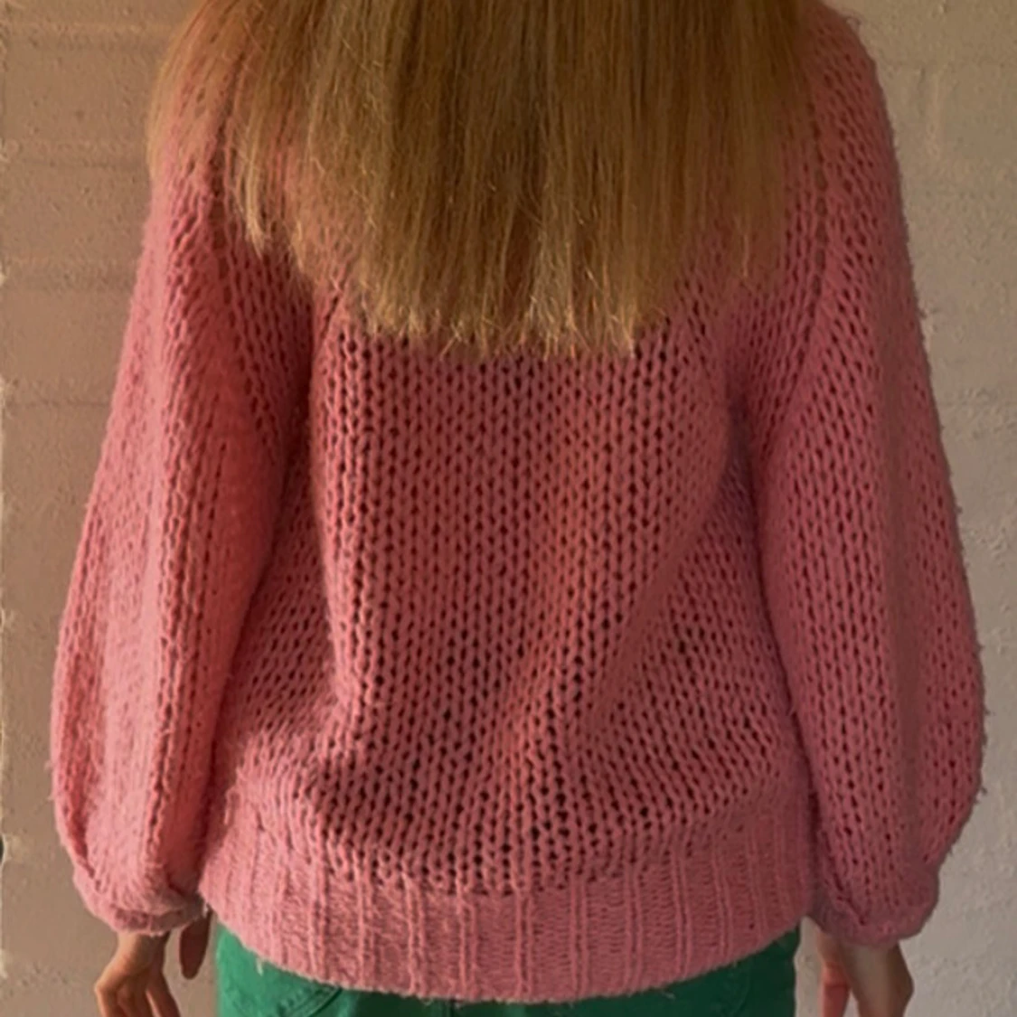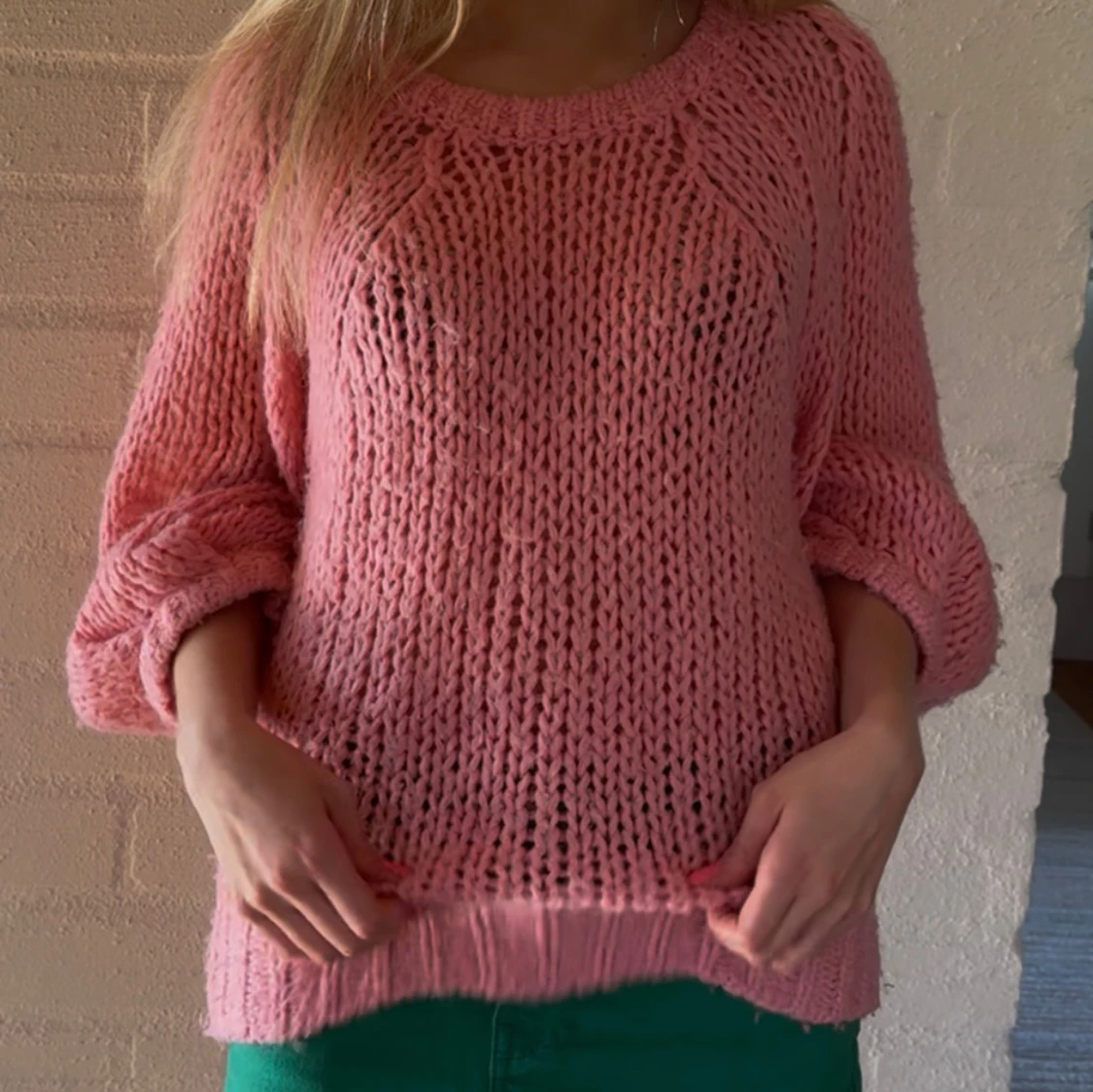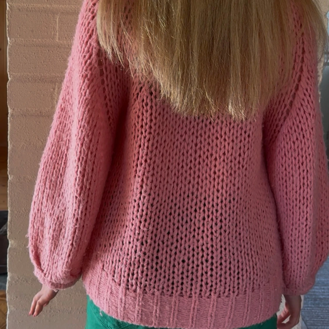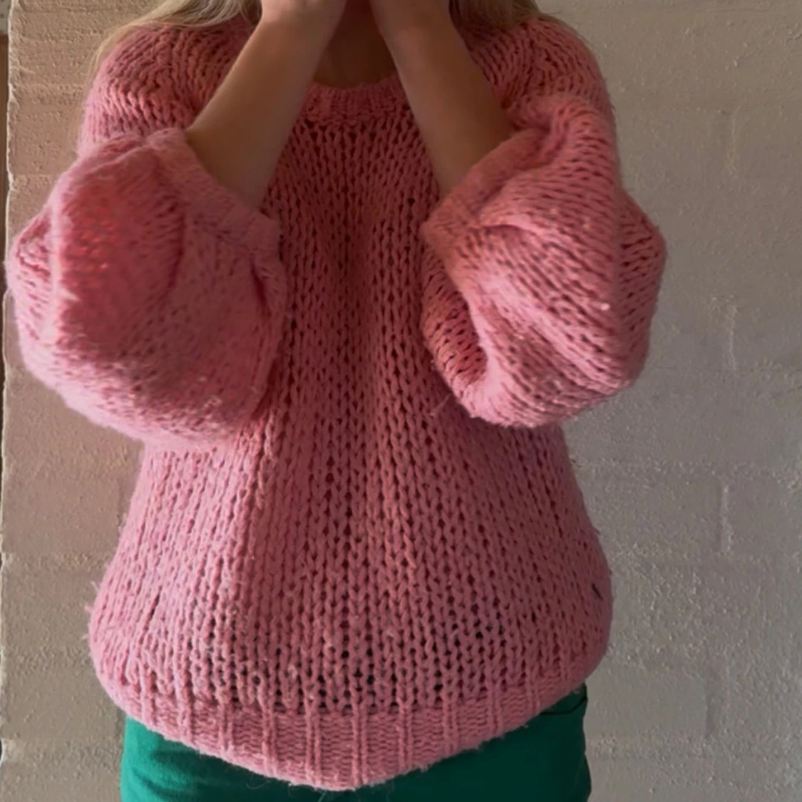 Supermysig rosa stickad tröja med oversized passform och grova maskor. Tröjan har långa ärmar och breda muddar vid ärmslut och nederkant.