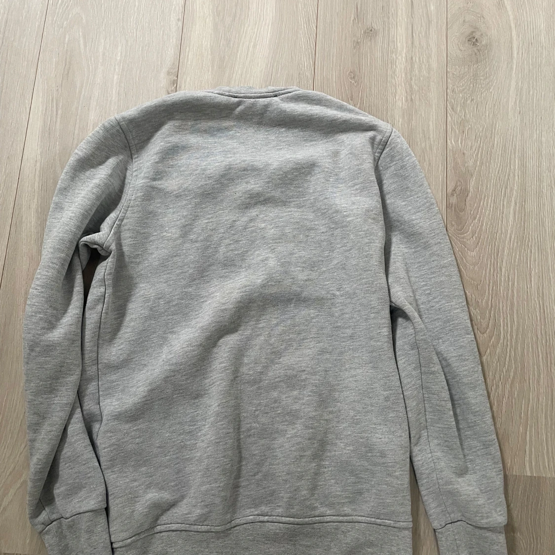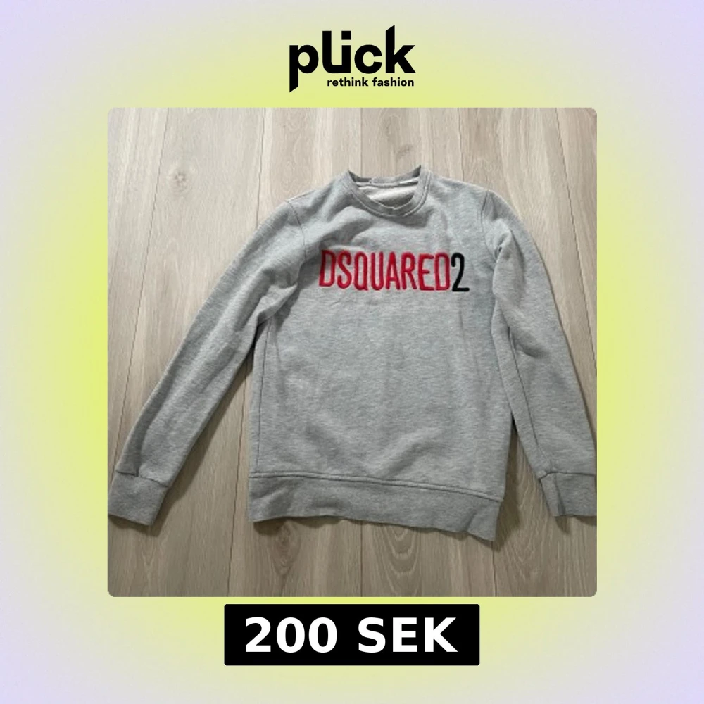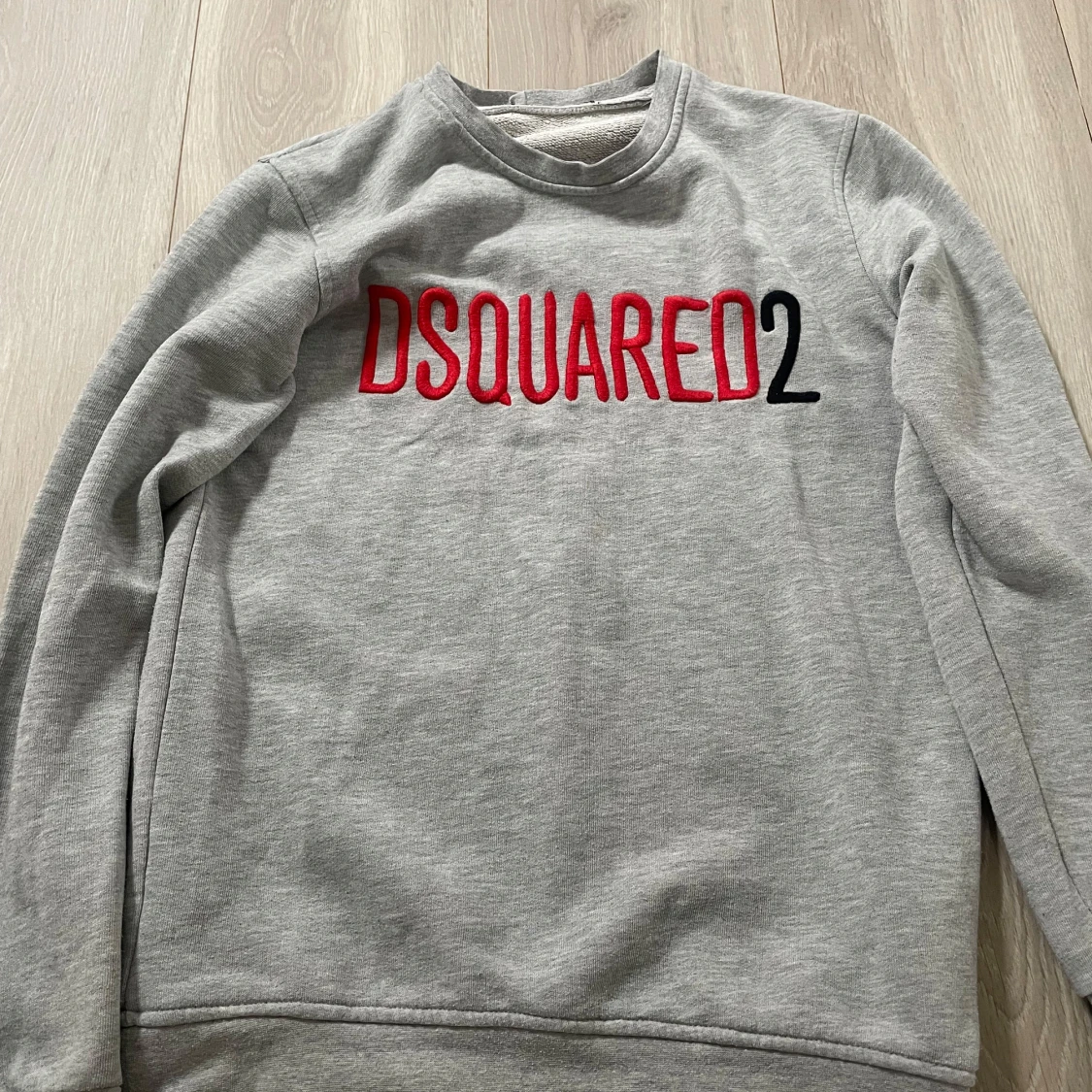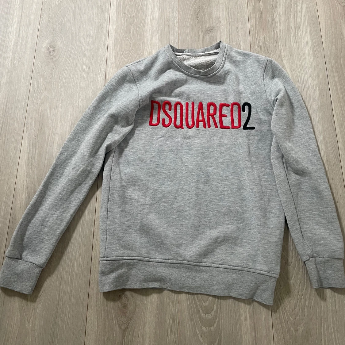 Säljer en stilren grå sweatshirt från Dsquared2 med logga i rött och svart broderi på bröstet. Tröjan har rund halsringning och långa ärmar. Perfekt för en avslappnad och trendig look.