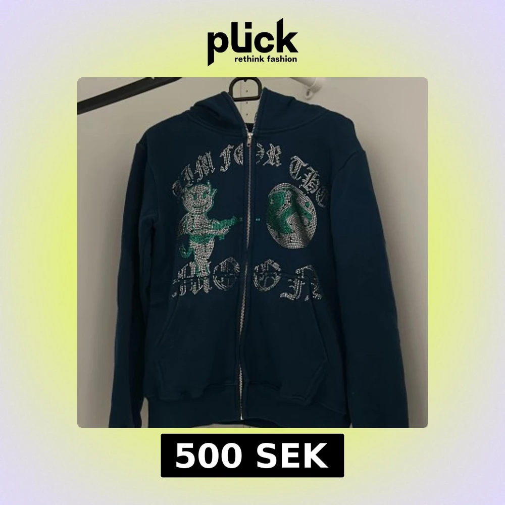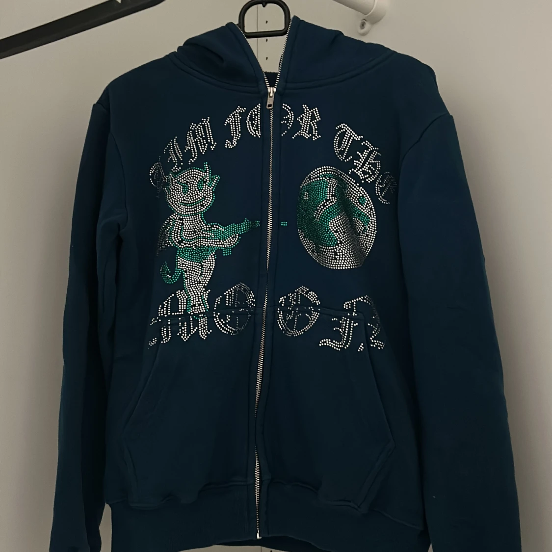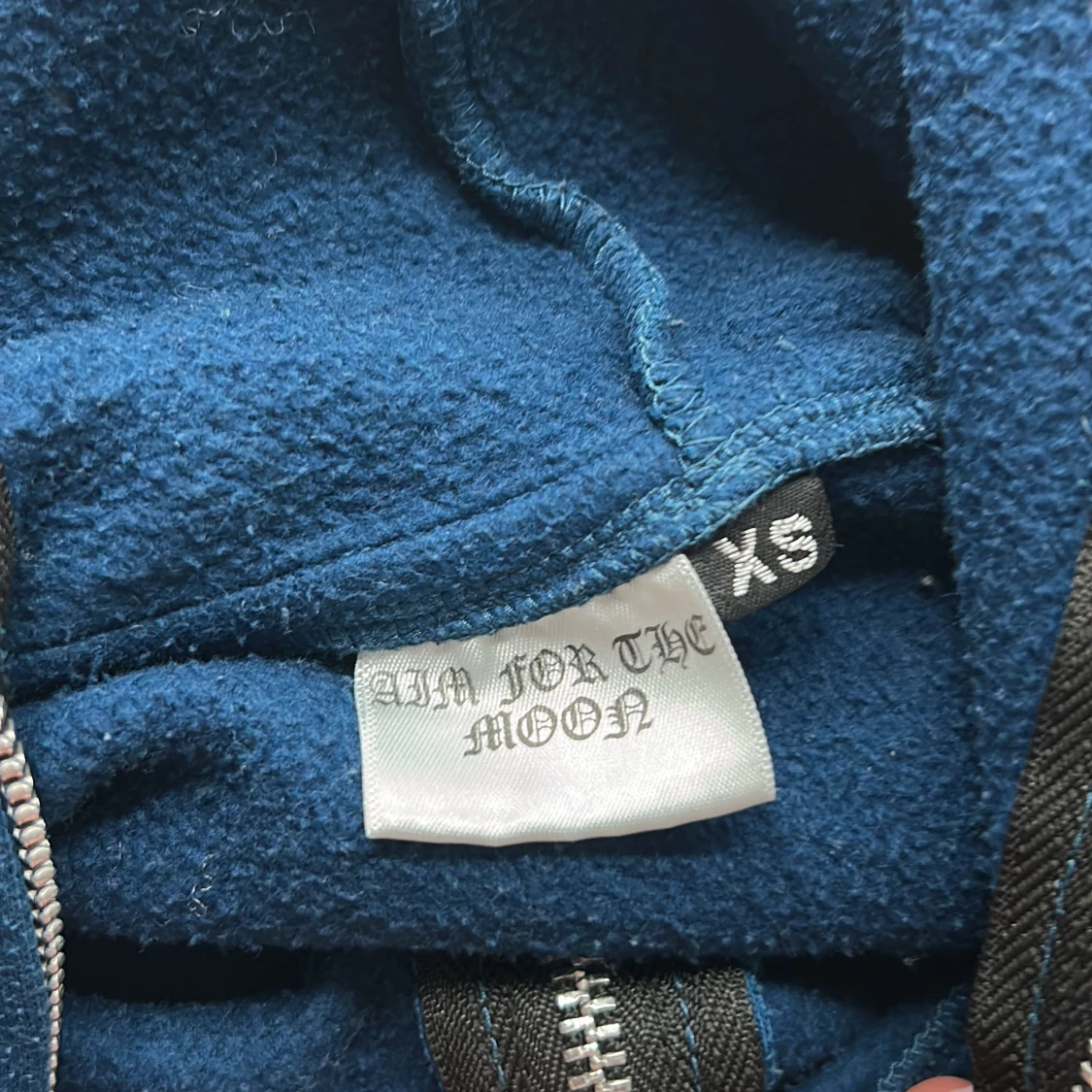 Snygg mörkblå aim for the moon hoodie storlek XS med dragkedja och huva❣️Bara ett fåtal stenar som har lossnat! Det finn inga fläckar eller liknande på tröjan🌸