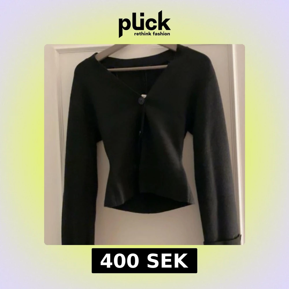 Säljer en svart stickad kofta med v-ringning och en knapp framtill. Koftan har lång ärm och en något croppad passform som ger en snygg siluett. Perfekt att slänga över en topp eller klänning för en stilren look. Aldrig använt (inte ens testat).