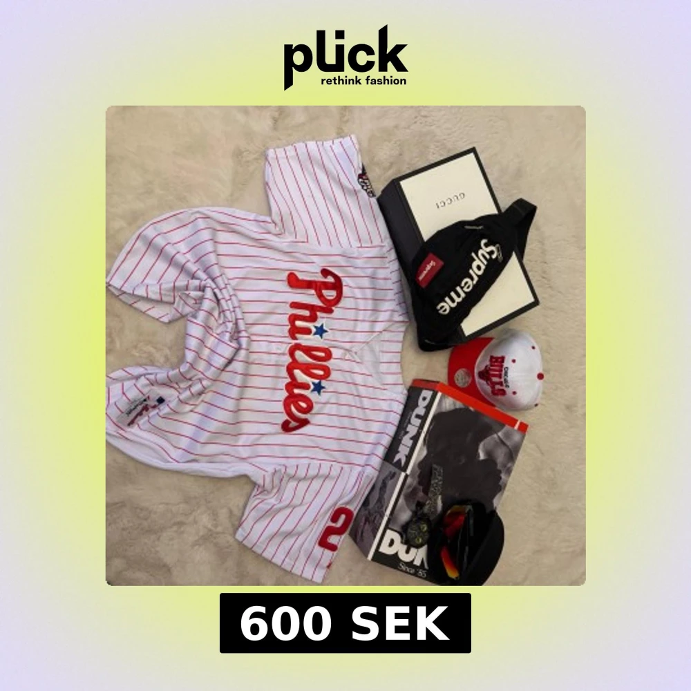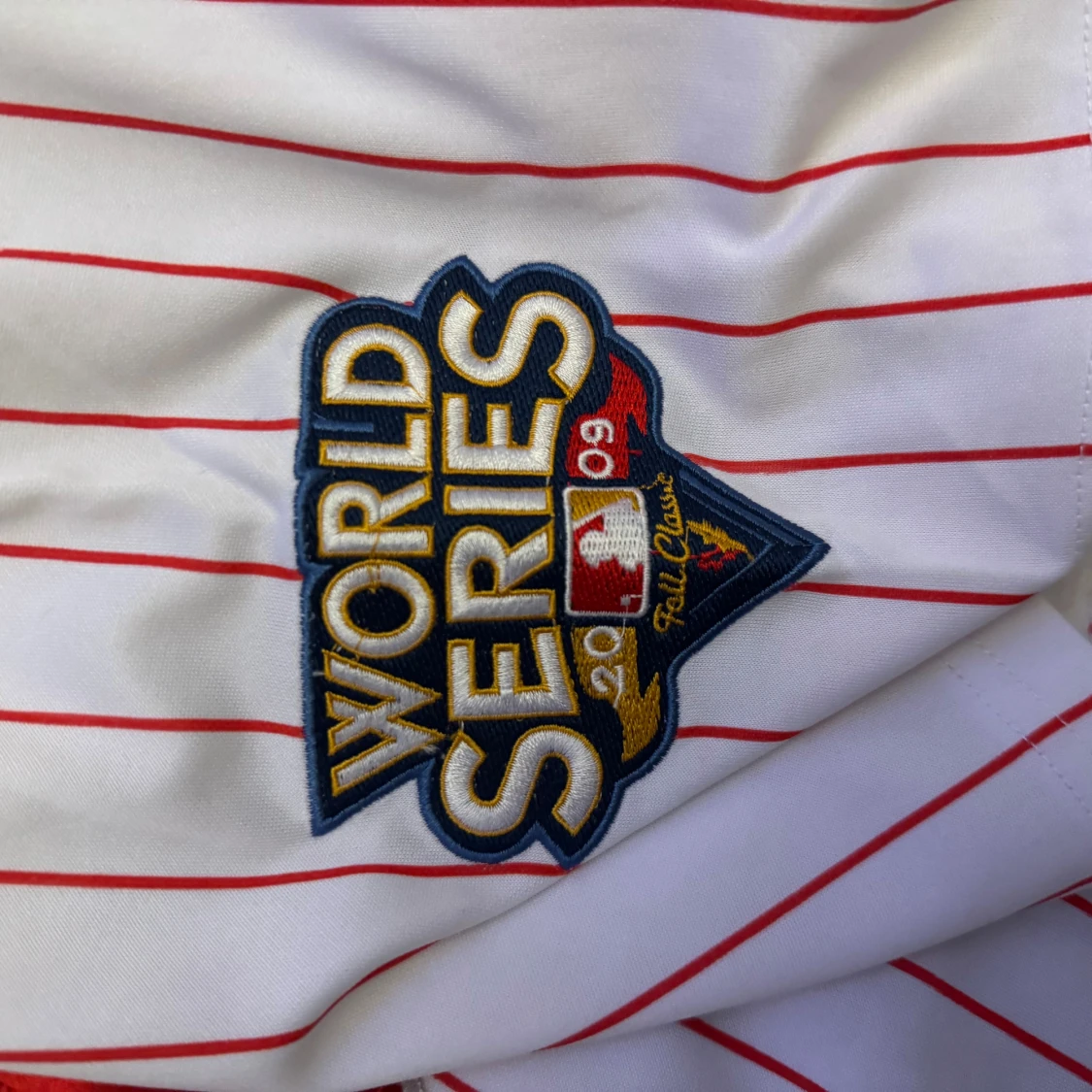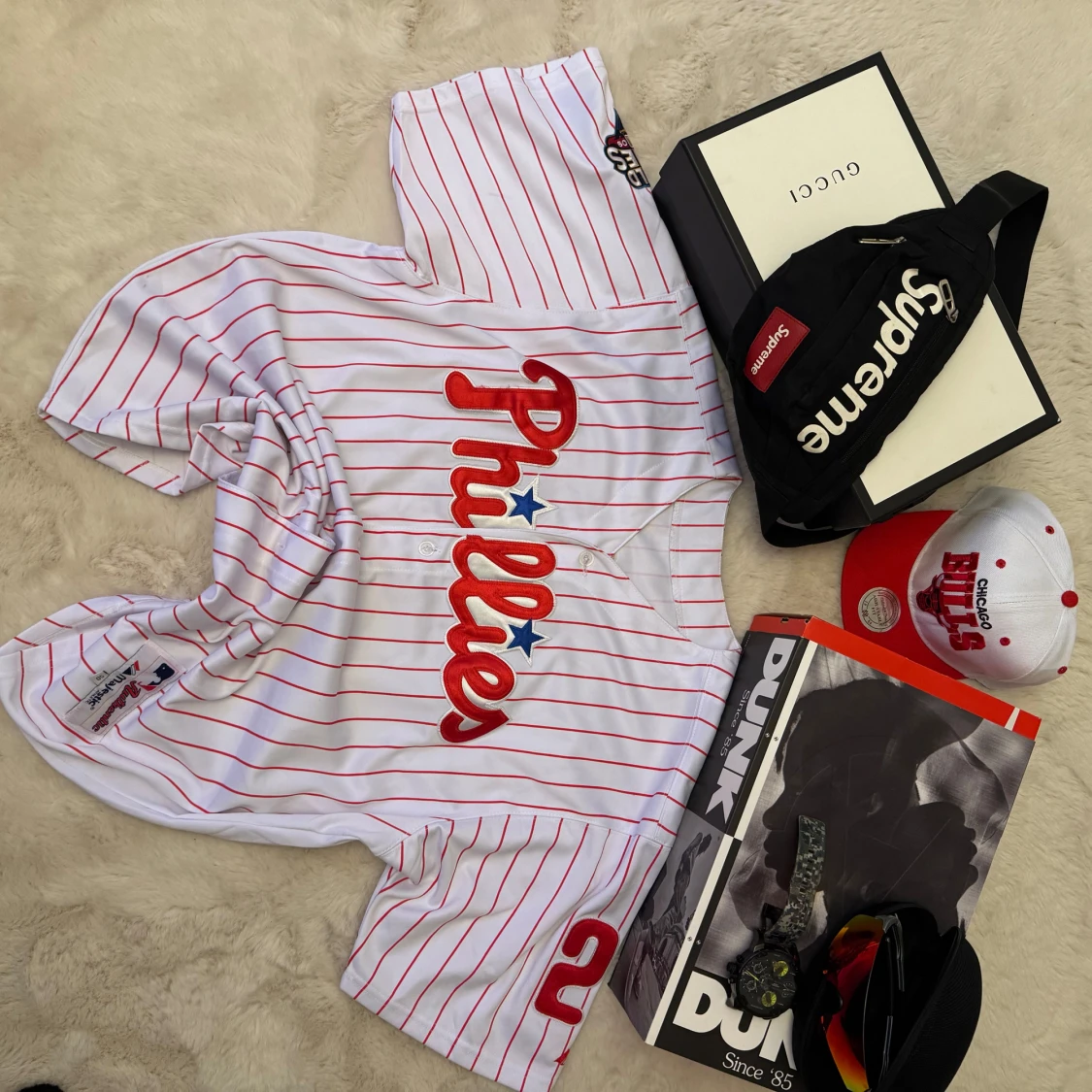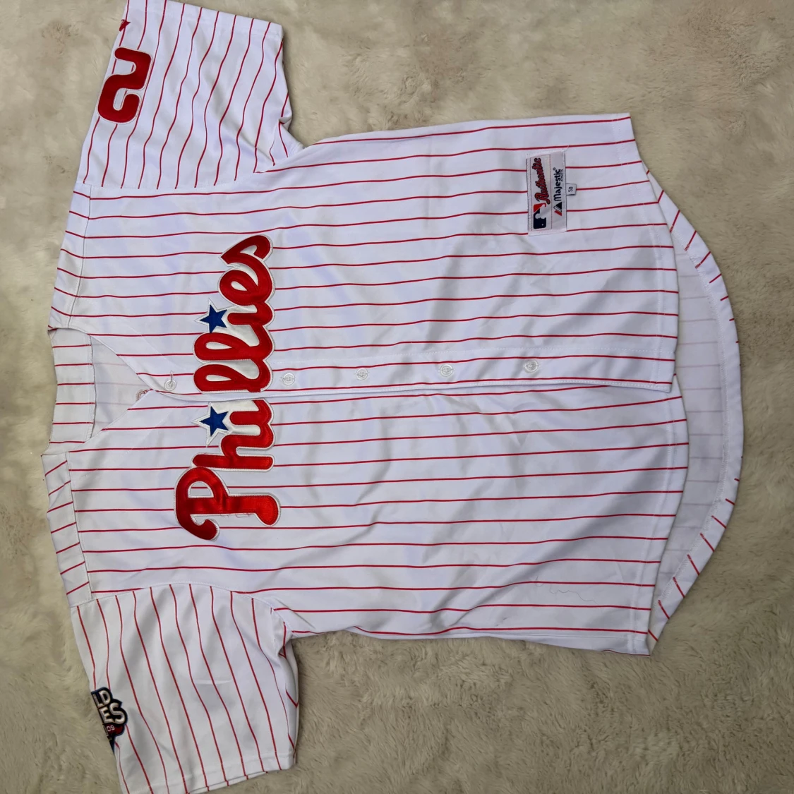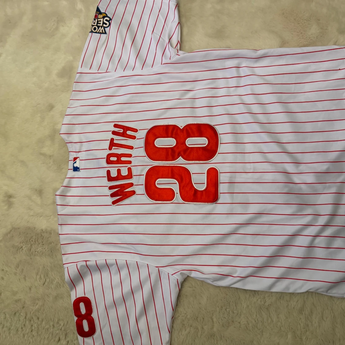 Säljer en vit baseballtröja från Majestic med röda ränder och Phillies-logga framtill. Nummer 28 och namnet Werth på ryggen. Knappar framtill och korta ärmar. Perfekt för dig som gillar sportig stil.