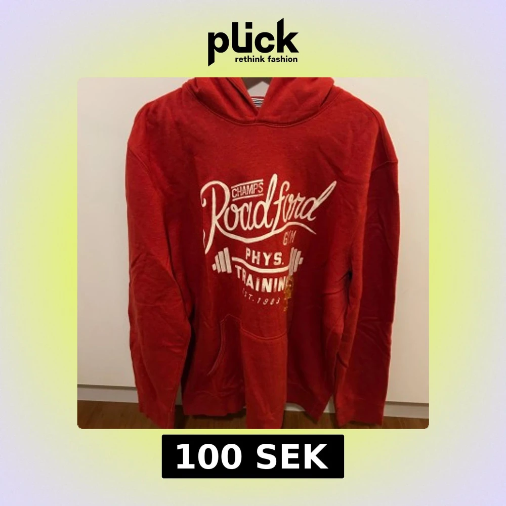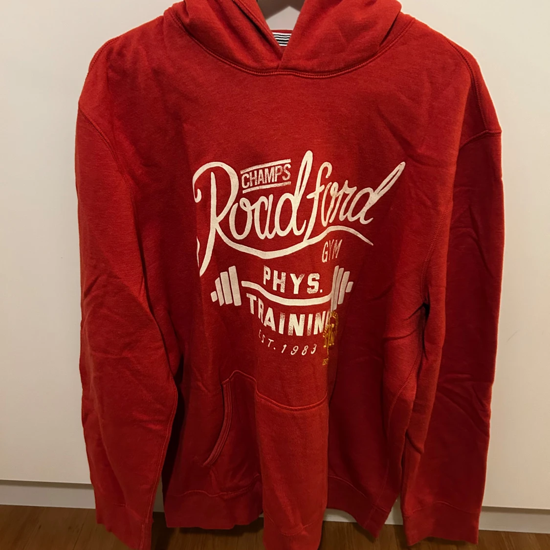 Säljer en röd hoodie från F&F med tryck på framsidan. Perfekt för träning eller en avslappnad dag. Den har en klassisk känguruficka och en bekväm huva.