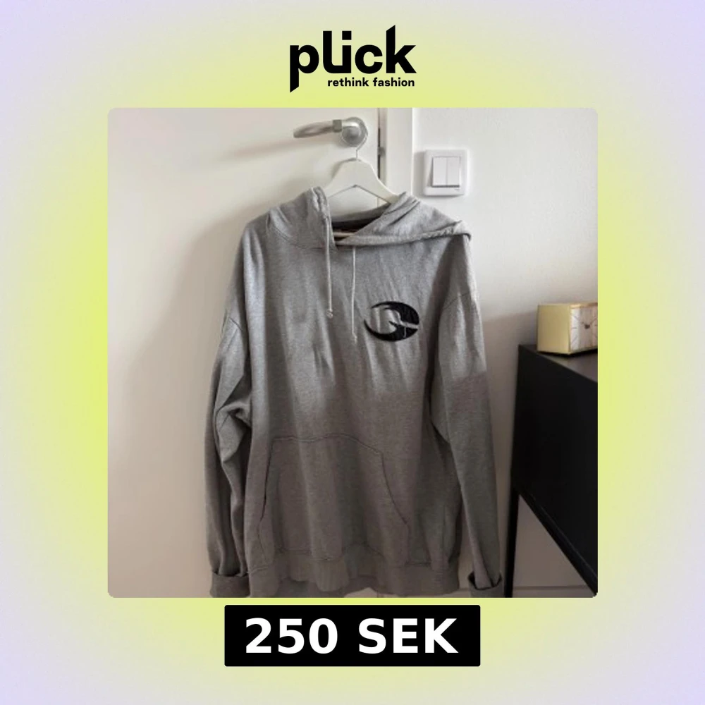 Säljer en grå hoodie med svart broderad logga på bröstet. Tröjan har huva med snörning och en stor magficka framtill. Perfekt för dig som gillar en avslappnad och stilren look.