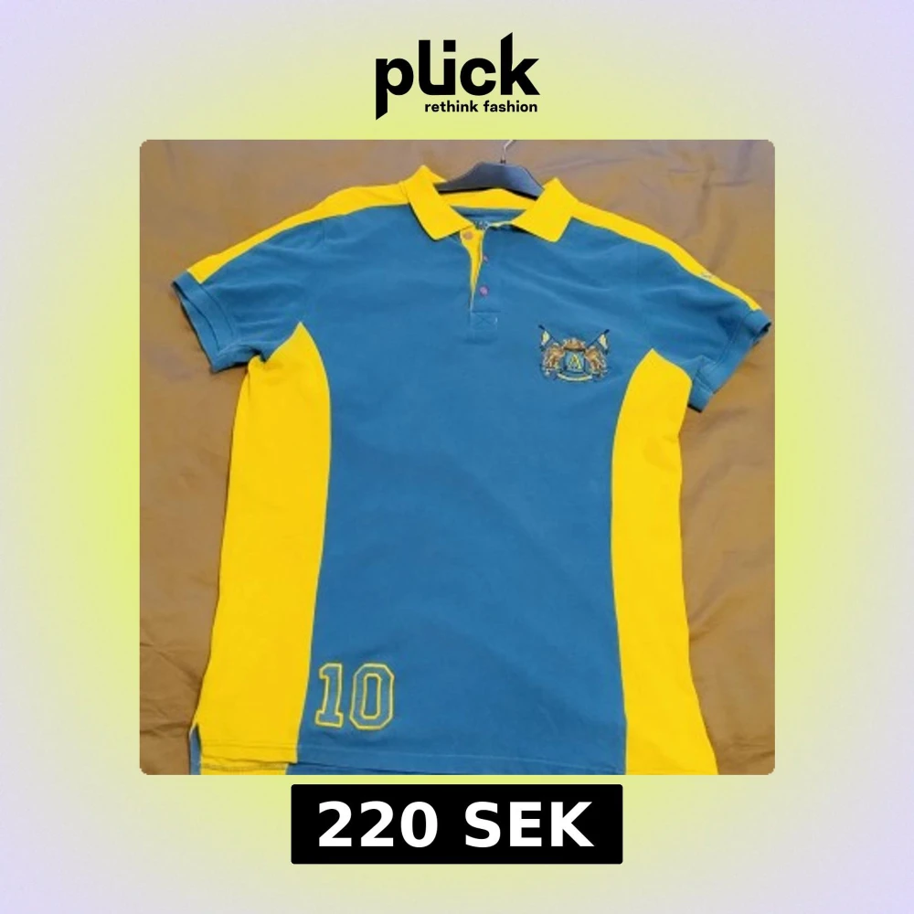 Snygg pikétröja i blått och gult med broderat emblem på bröstet, stora gula siffror 10 fram och bak samt texten SWEDEN på ryggen. Kragen har broderad text och tröjan har klassisk pikéknäppning. Perfekt för dig som vill sticka ut med sportig stil.