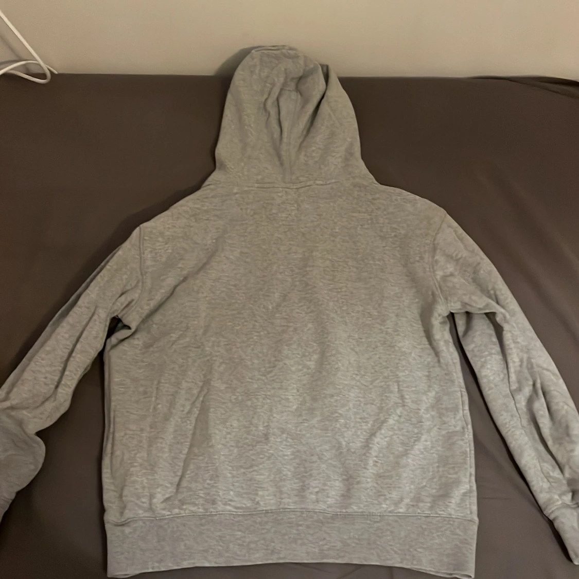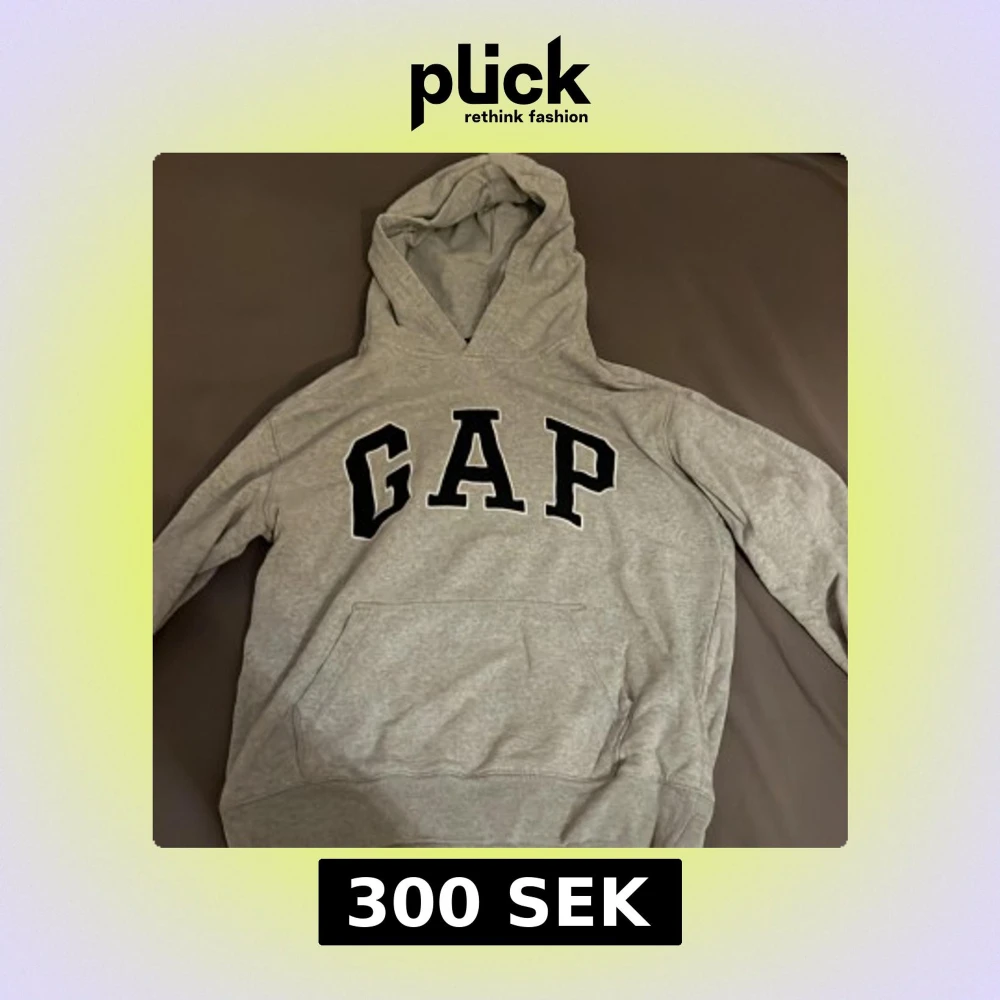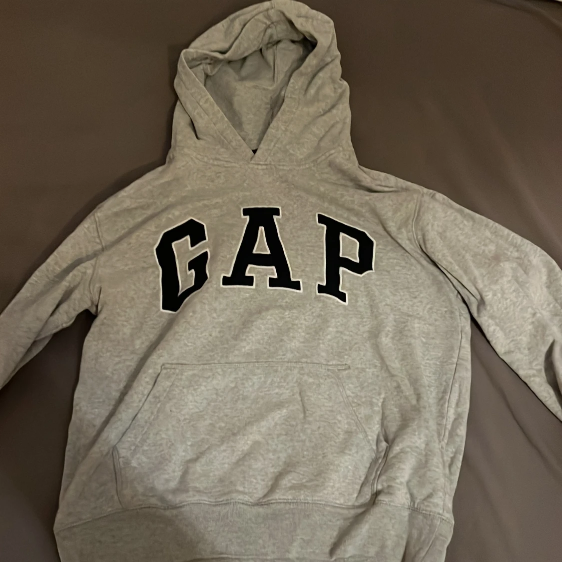 Säljer en klassisk grå hoodie från GAP med stor logga på bröstet. Tröjan har en bekväm passform med känguruficka och ribbade muddar. Perfekt för en avslappnad stil.