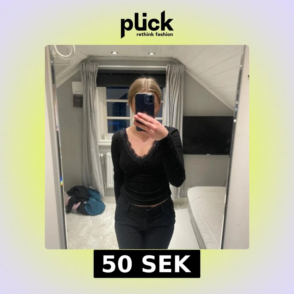 Supersnygg svart långärmad topp från Amisu i ribbat material. Djup v-ringning både fram och bak med fina spetsdetaljer längs kanterna.