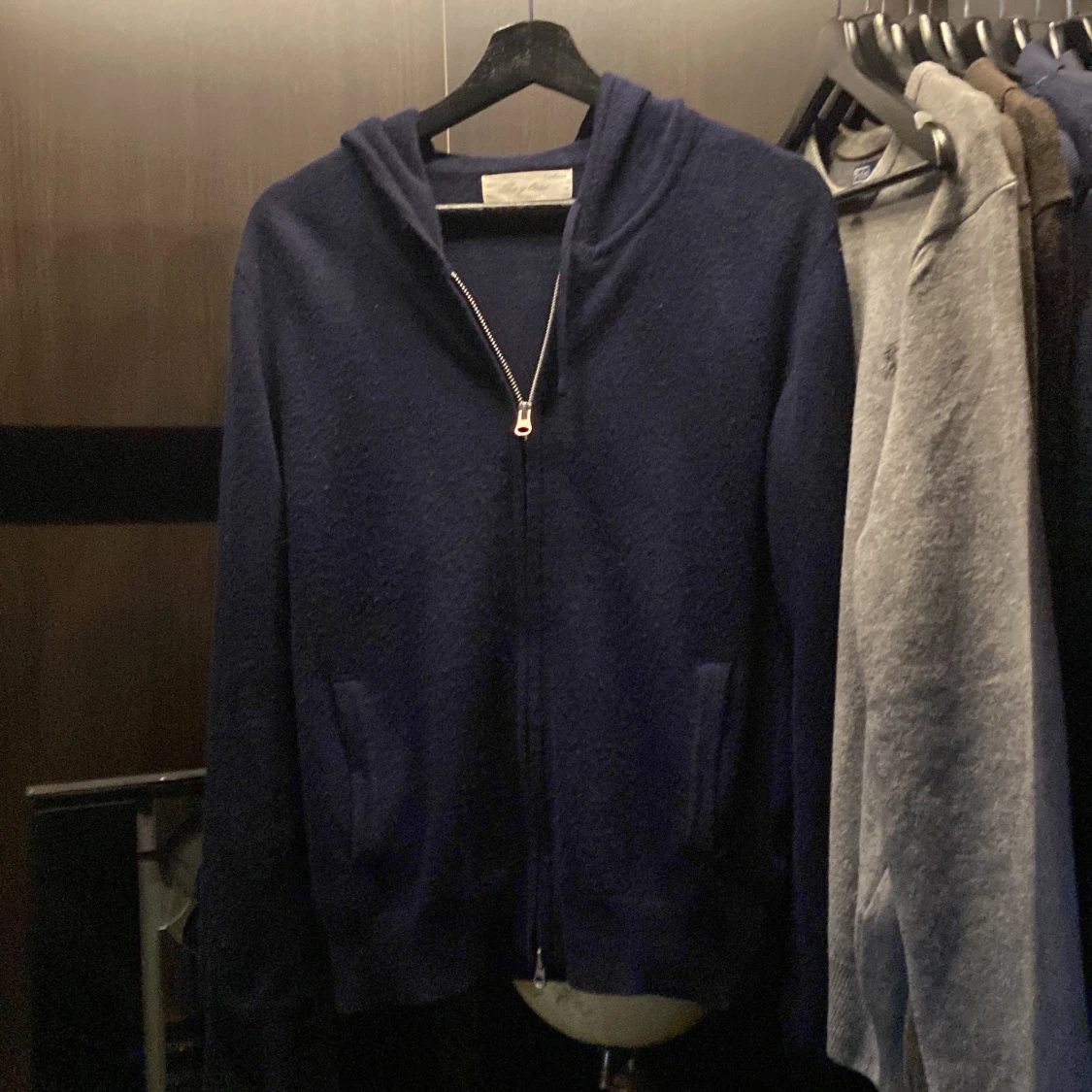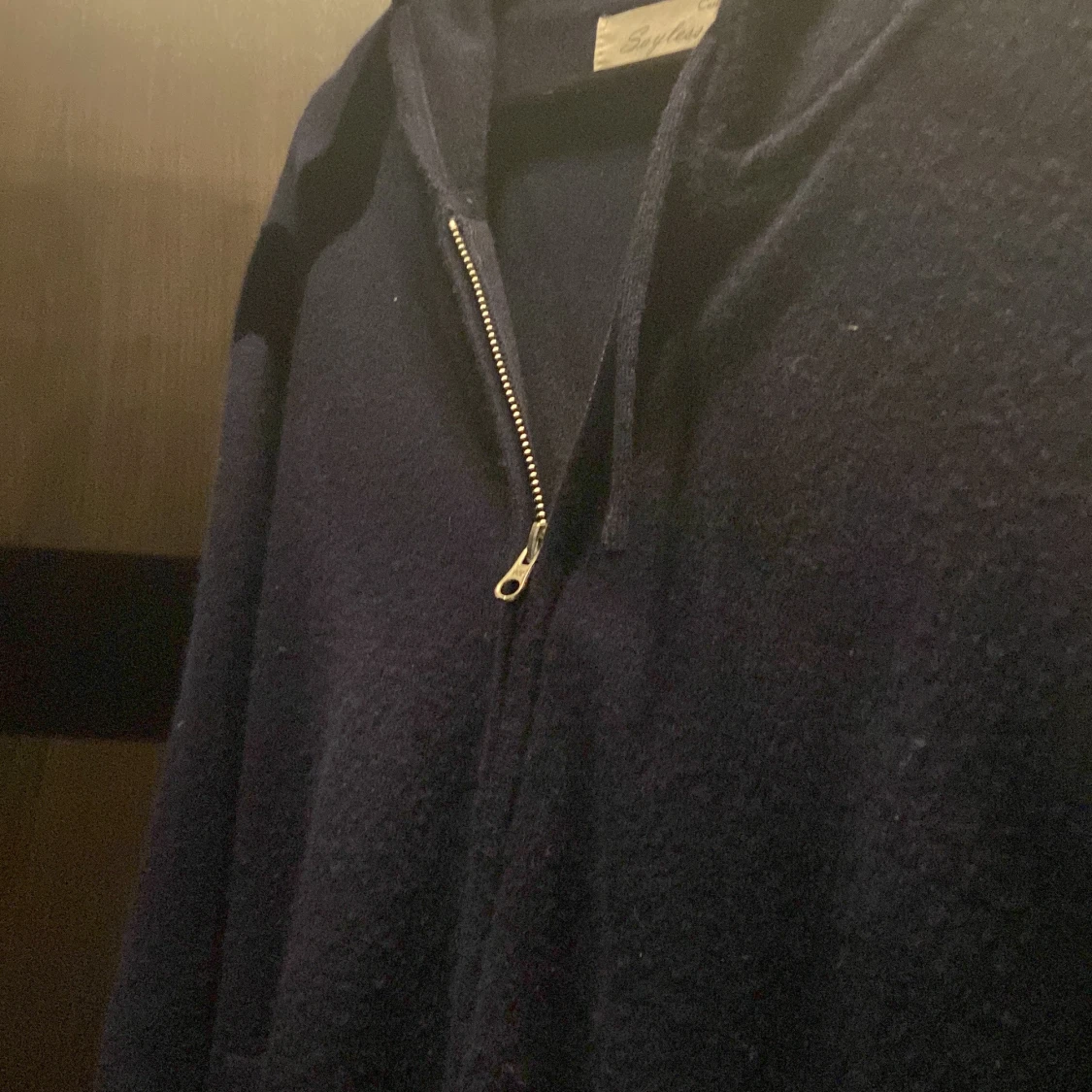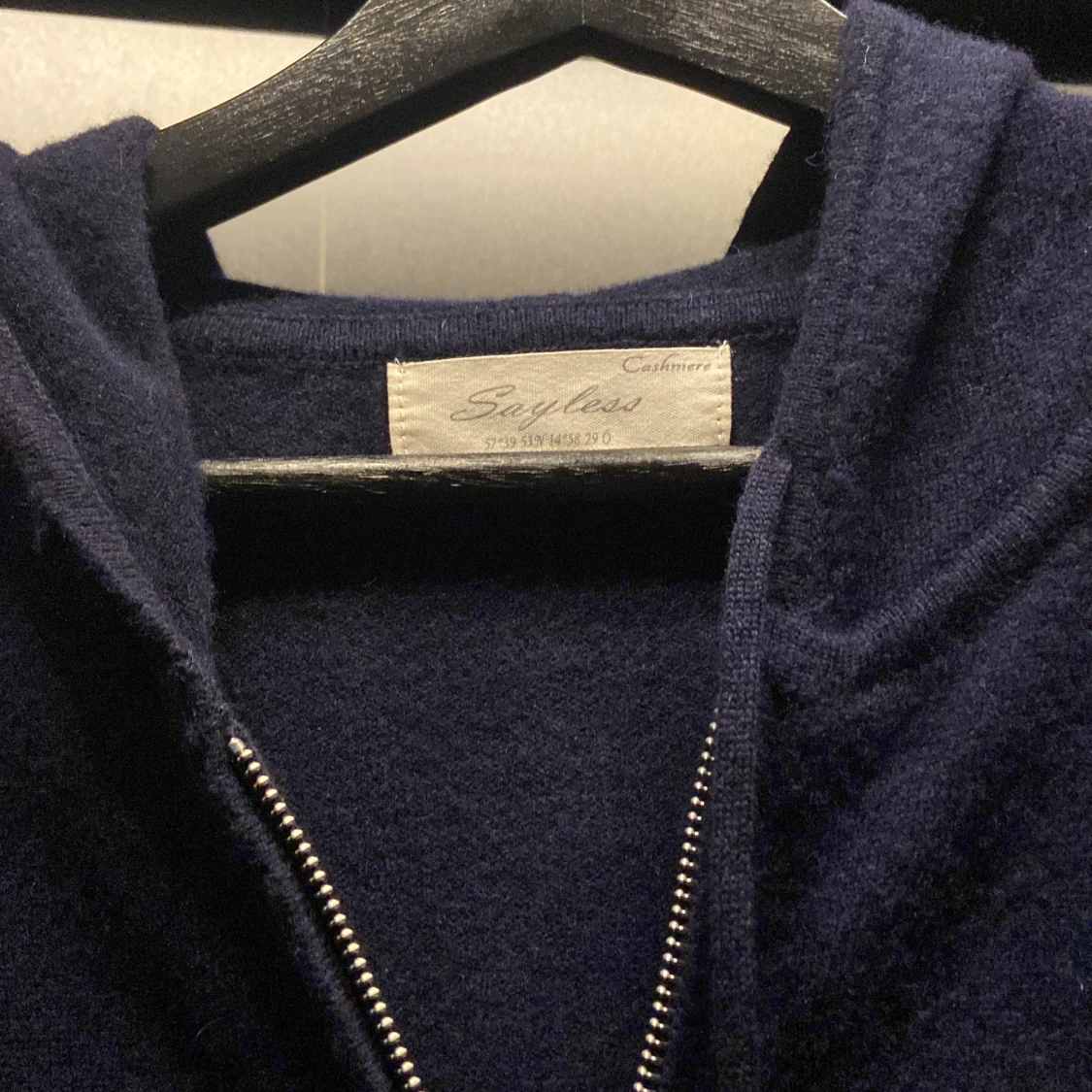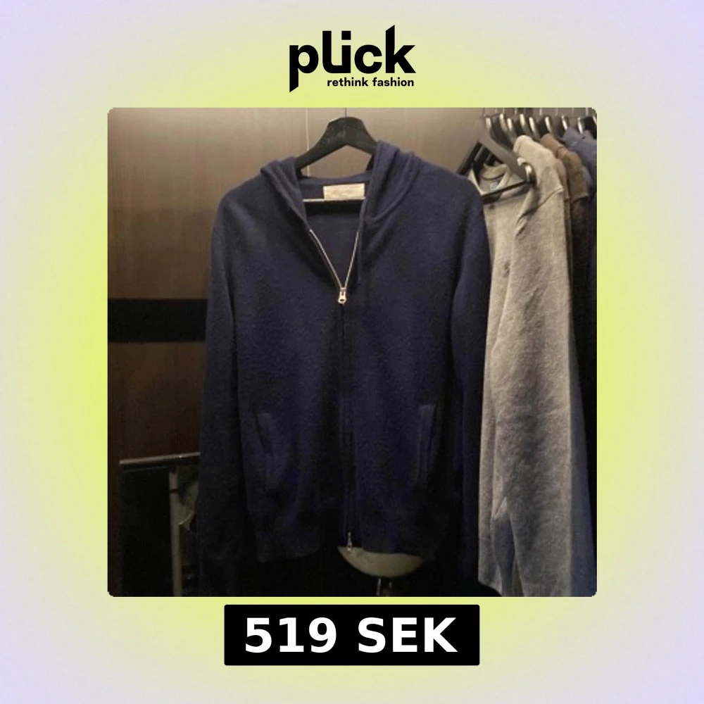 Mysig mörkblå hoodie från Sayless i lyxig kashmir. Tröjan har dragkedja framtill, huva och två fickor. Perfekt för dig som vill ha en stilren och bekväm look med exklusiv känsla. Passar nån runt 165-175, sitter mer som XS/liten S