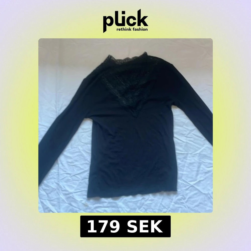 Säljer en svart långärmad topp med vacker spets runt halsringningen och ärmsluten. Toppen har en elegant v-ringad spets framtill och är tillverkad i ett mjukt, stretchigt material. Perfekt för dig som gillar detaljer och vill ha något extra till din outfit.
