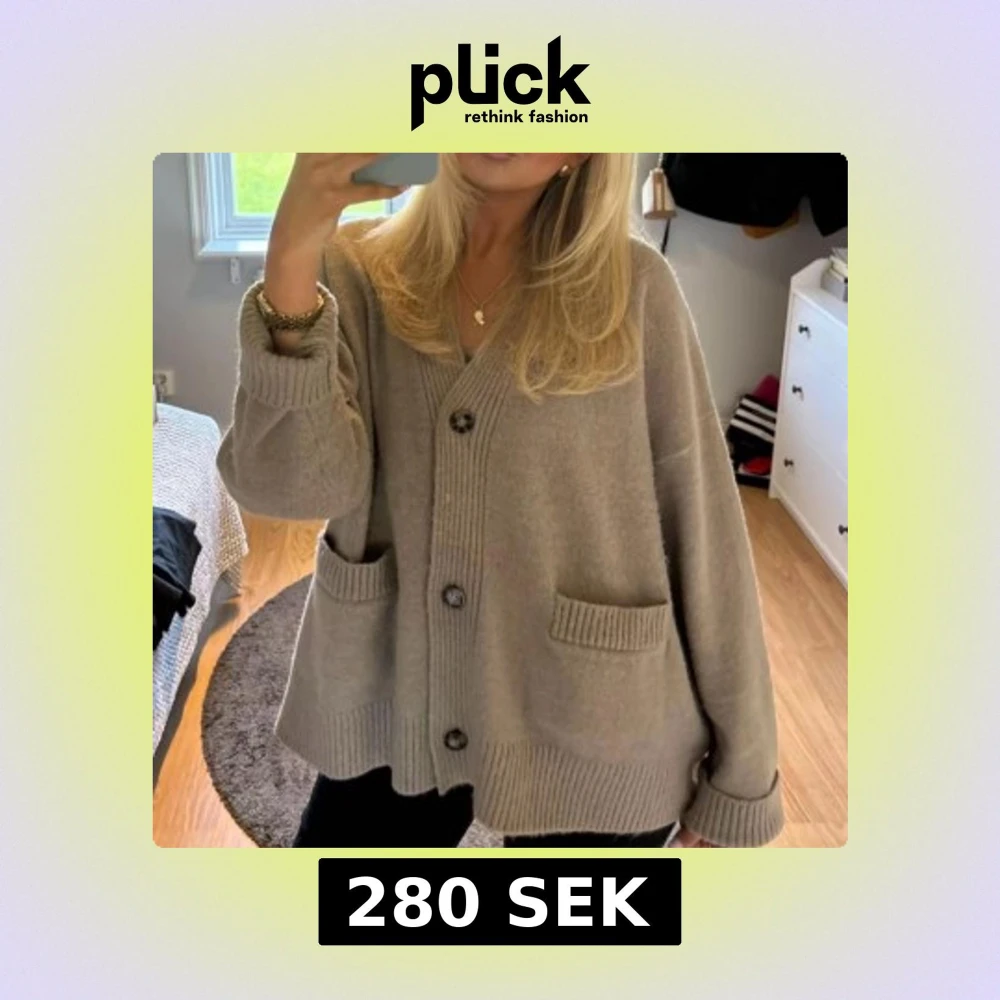 Mysig beige kofta med stora knappar och två fickor framtill. Den har en loose passform och långa ärmar, perfekt för kyliga dagar. Ribbstickade detaljer vid ärmslut och nederkant.