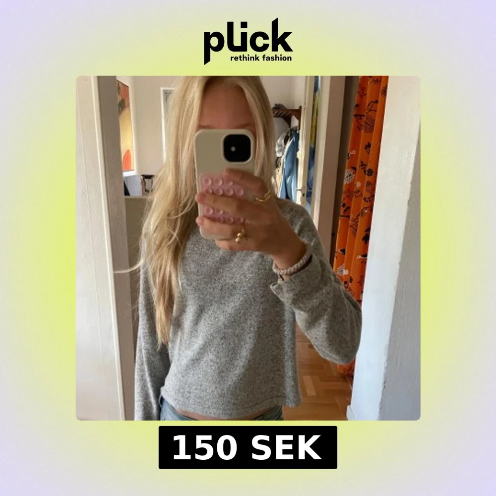Mysig grå stickad tröja med lång ärm och avslappnad passform. Perfekt för kyliga dagar och enkel att matcha med jeans eller kjol. Tröjan har en klassisk rund hals och är lite croppad i modellen.