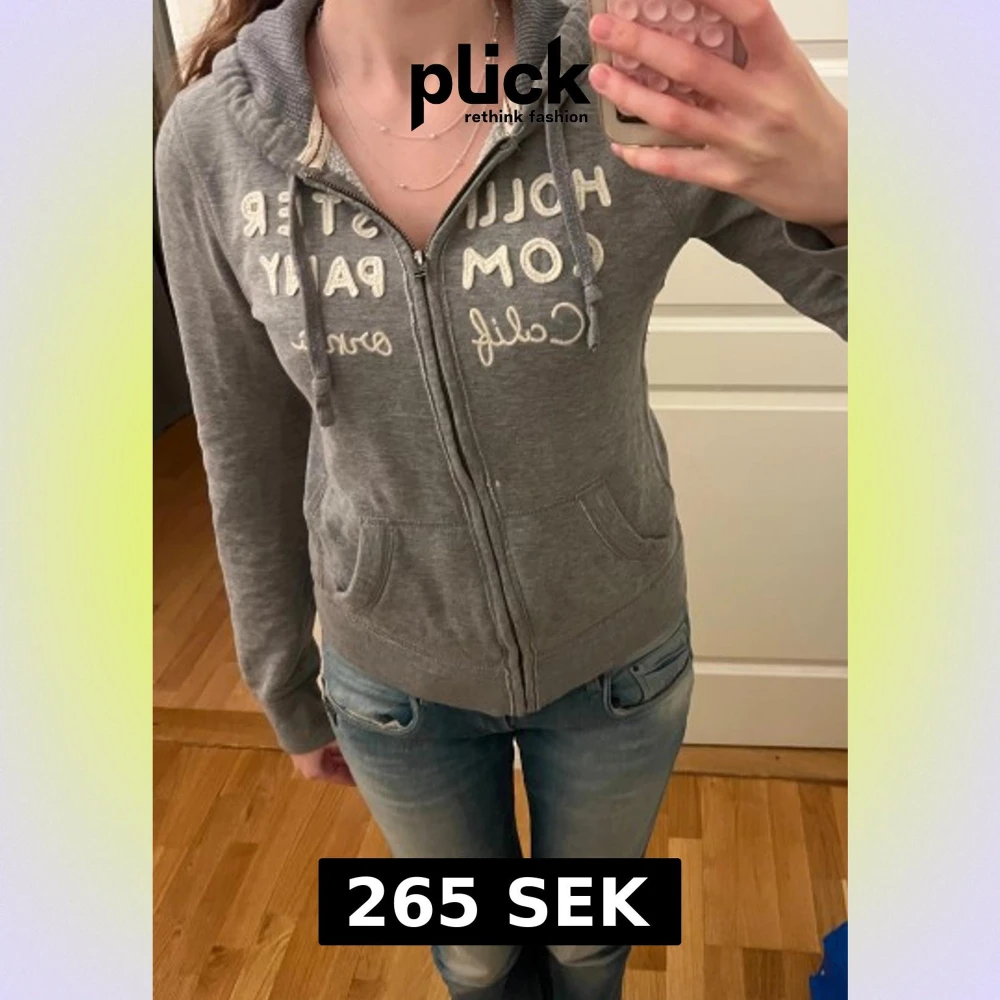 Säljer en grå hoodie från Hollister med vit broderad text på bröstet. Tröjan har huva med snörning, två fickor fram och dragkedja hela vägen. Mjuk insida och klassisk passform. Storlek S. Säljer då den inte kommer till användning!💗