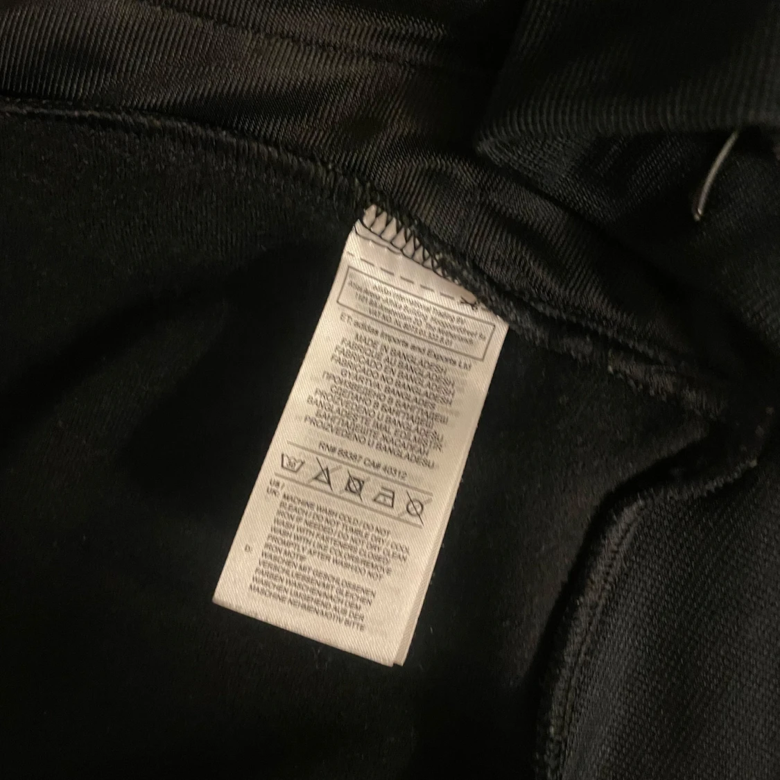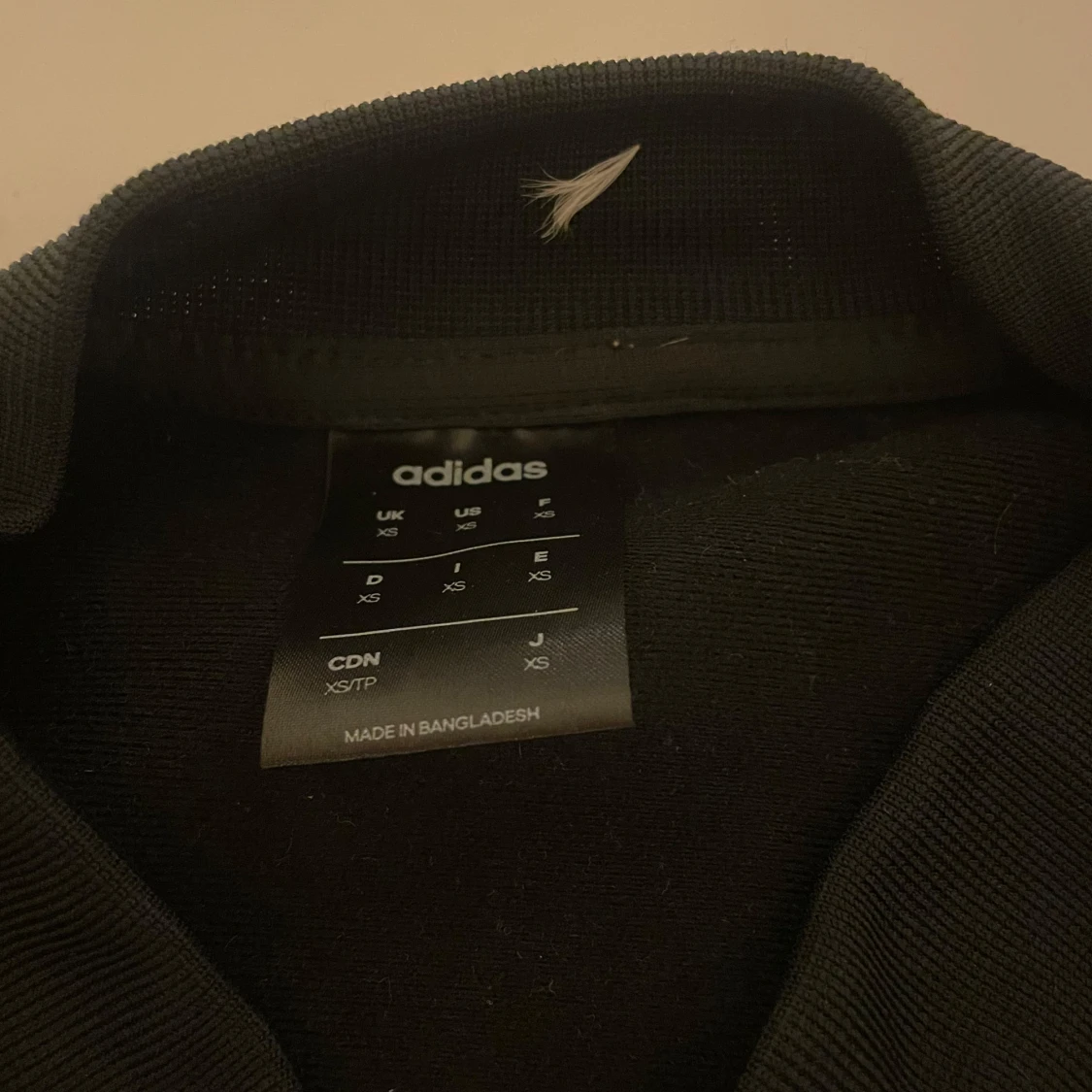 Svart ziptröja från Adidas i storlek XS med klassiska vita ränder längs ärmarna och Adidas-logga på bröstet. Tröjan har hel dragkedja framtill och ribbade muddar. Perfekt för en sportig och avslappnad stil.