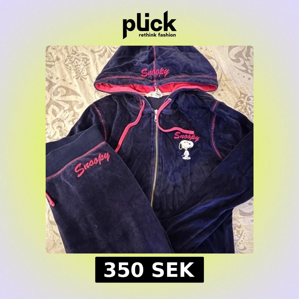 Mysig mörkblå/mörklilla hoodie från H&M med Snoopy-brodyr och rosa detaljer. Jackan har dragkedja, huva med rosa foder och snörning samt broderad Snoopy-text på bröstet och huvan. Byxorna ingår också,dom är väldigt sköna och sitter väldigt bra på. Det står dok att dom e xs men jag skulle vilja säga att dom är s .🩷Perfekt för chill dagar eller när du vill ha något bekvämt och snyggt. 🩷💗💋