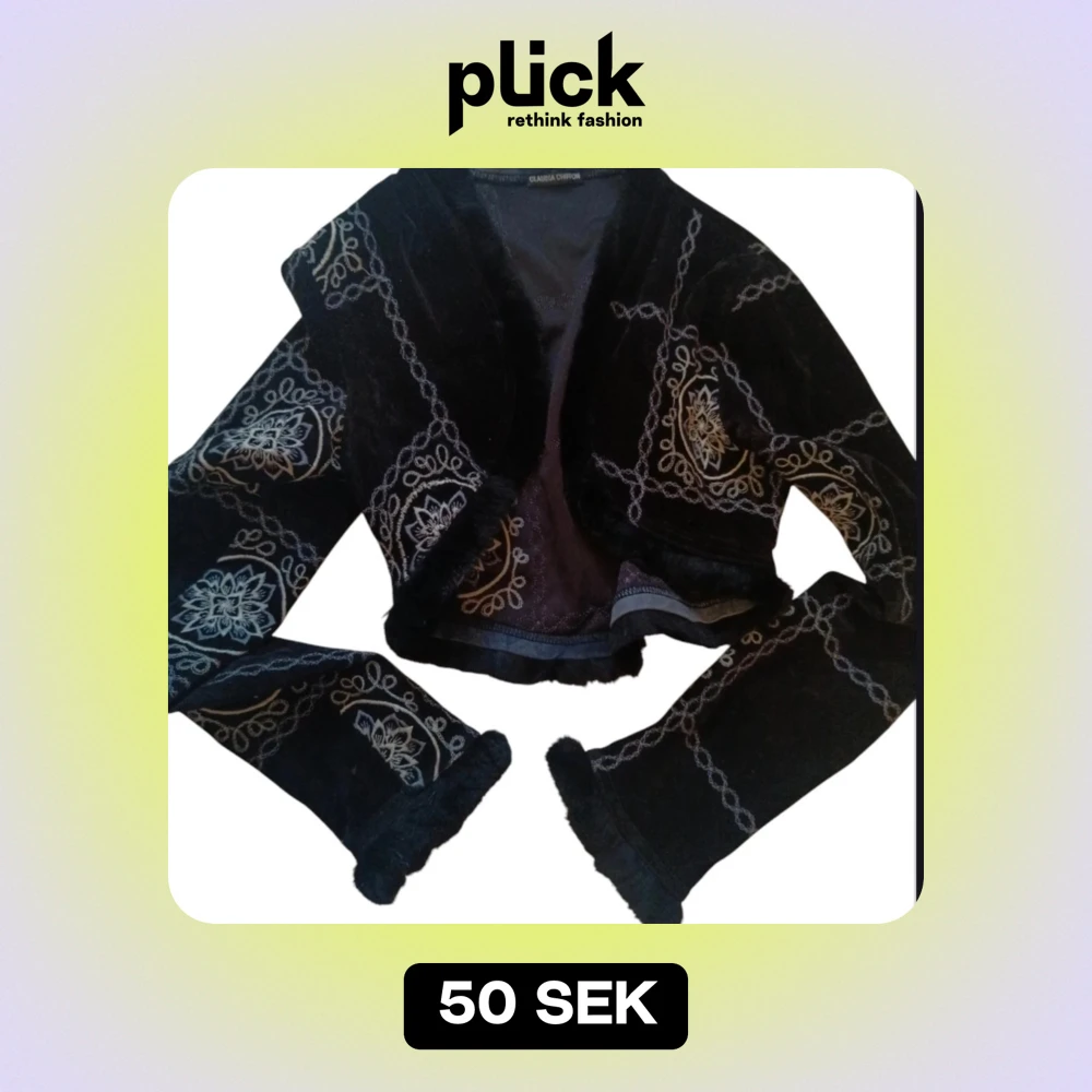 Säljer en superfin svart kavaj i sammet från Claudia Chiffon. Den är croppad och har vackra broderade mönster i vitt. Perfekt för höst och vinter, och funkar både till fest och vardag. Ärmarna är långa och ger en elegant look. Passar perfekt till en kjol eller jeans!