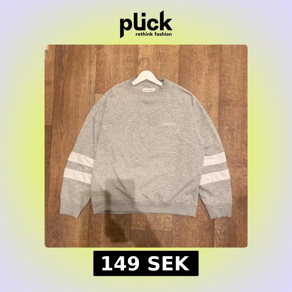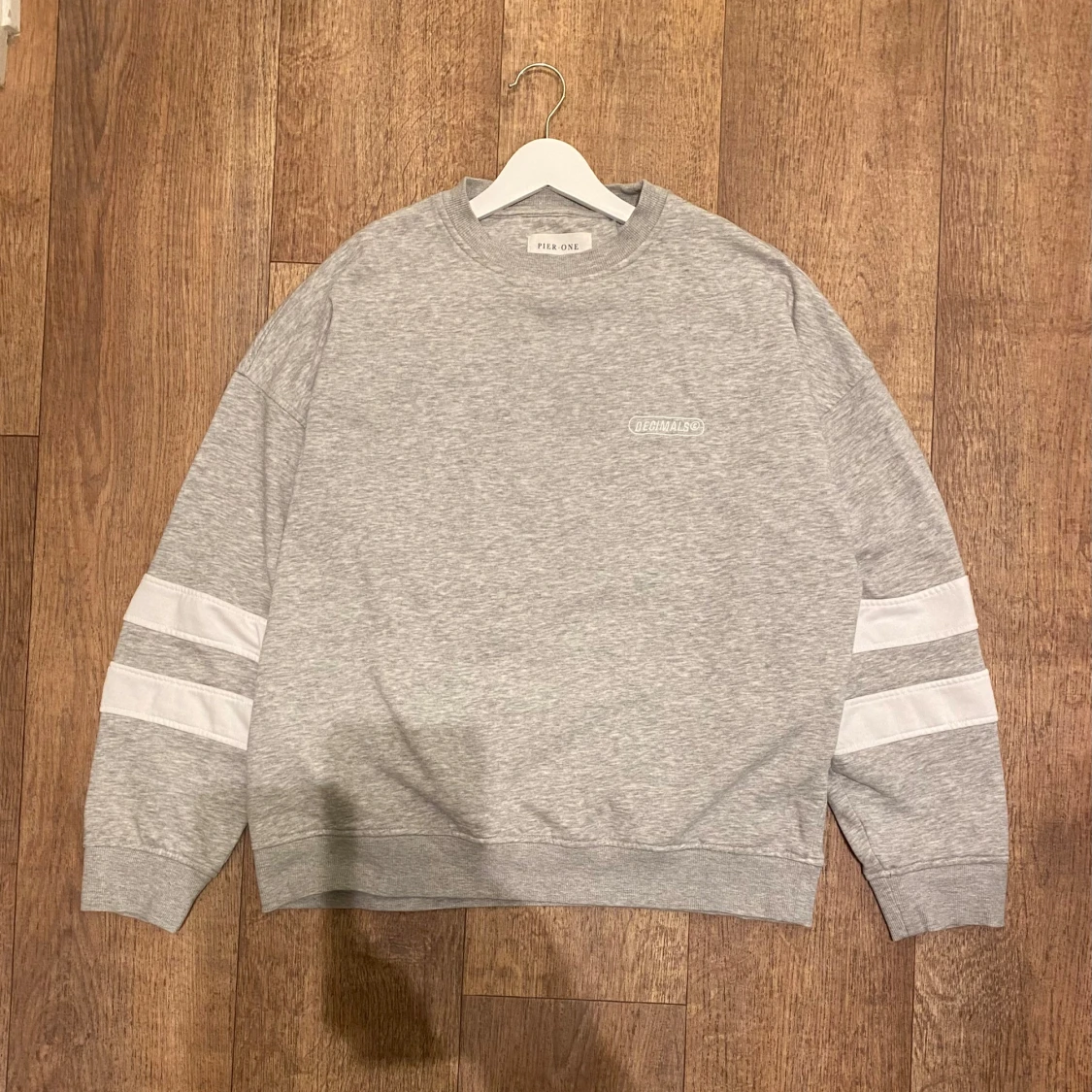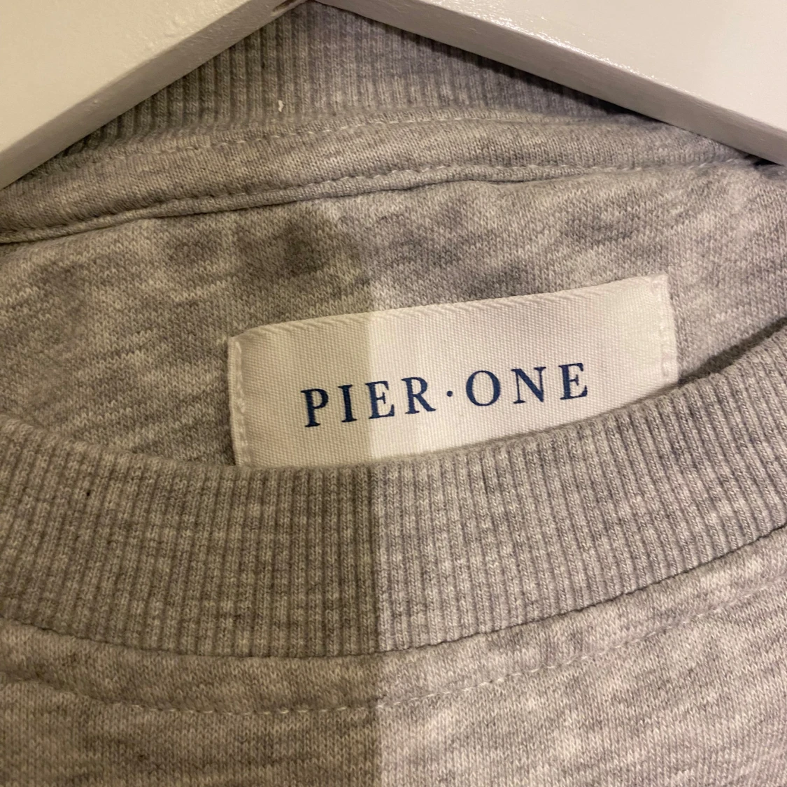 Säljer en stilren grå sweatshirt från Pier One med vita ränder på ärmarna och ett subtilt tryck på bröstet. Tröjan har en oversized passform och långa ärmar, perfekt för en avslappnad look. Storlek Small. Snabb Leverans!