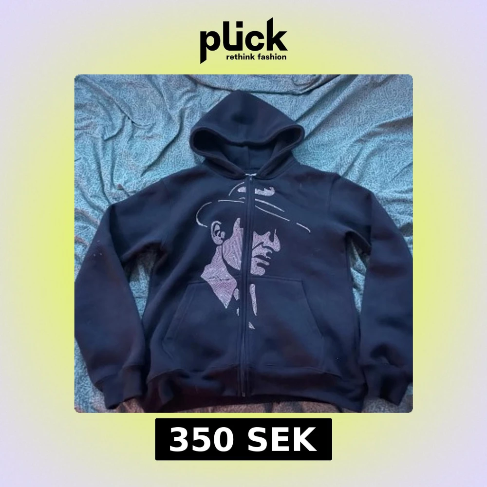 Svart hoodie från Costino Stockholm med dragkedja och huva. Framsidan har ett stort tryck av en person med hatt i vitt. Mjuk insida och kängurufickor framtill. Perfekt för dig som gillar streetstyle och vill sticka ut.