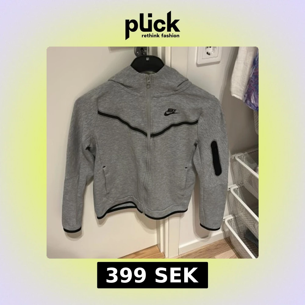 Grå hoodiejacka från Nike tech med hel dragkedja, svart Nike-logga på bröstet och svarta detaljer längs bröstet och ärmslut. Jackan har huva, lång ärm och en praktisk ficka med dragkedja på ena ärmen. Perfekt för en sportig och chill stil. Använt 4-5 gånger. Värde på 900 kr.