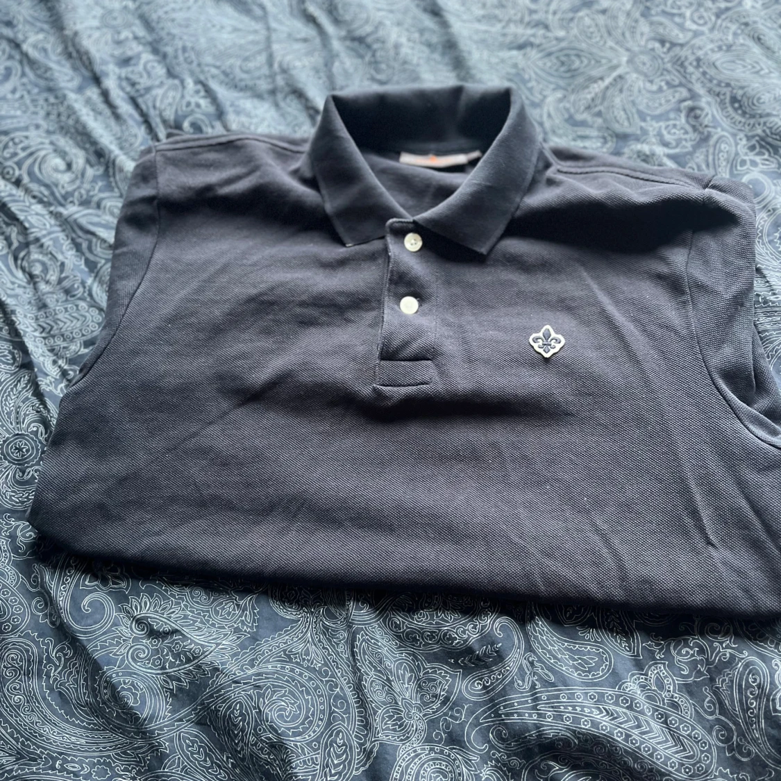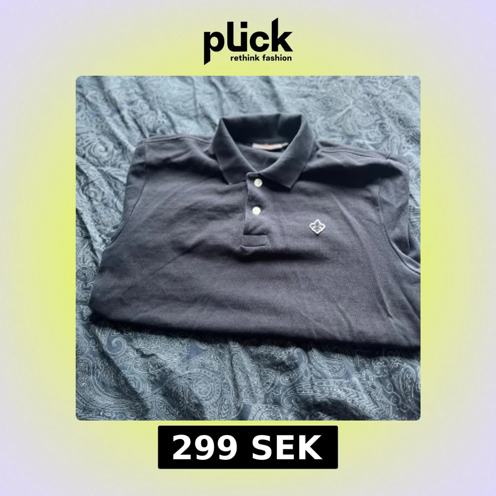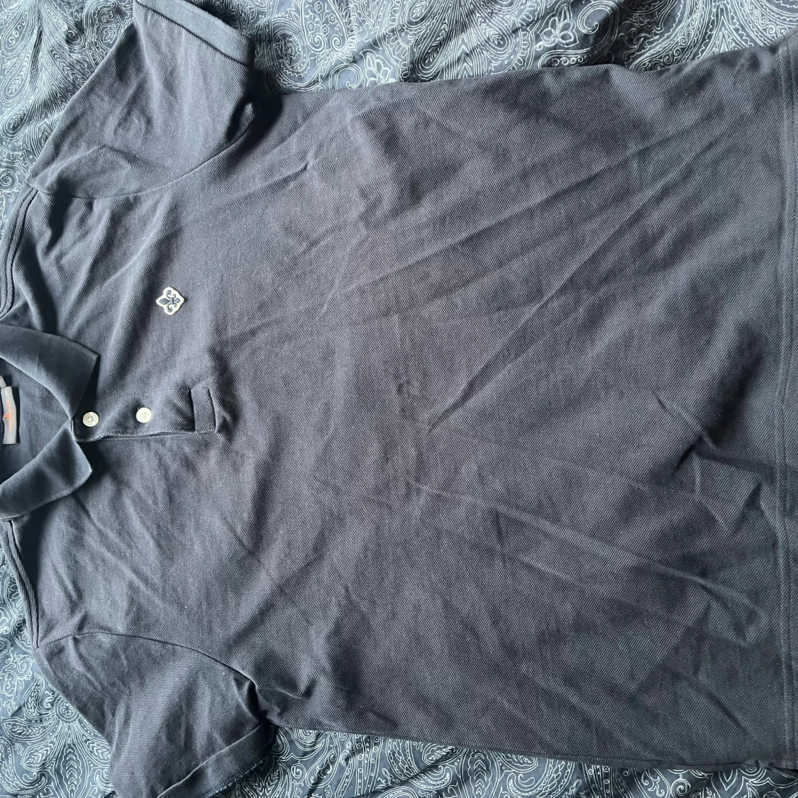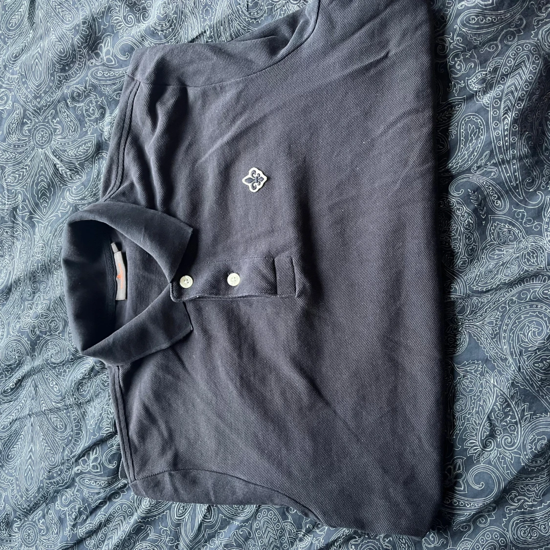 Säljer en mörkblå pikétröja från Morris med klassisk krage, två vita knappar och snygg broderad logga på bröstet. Tröjan är i bomull och har korta ärmar, perfekt för en stilren och avslappnad look.