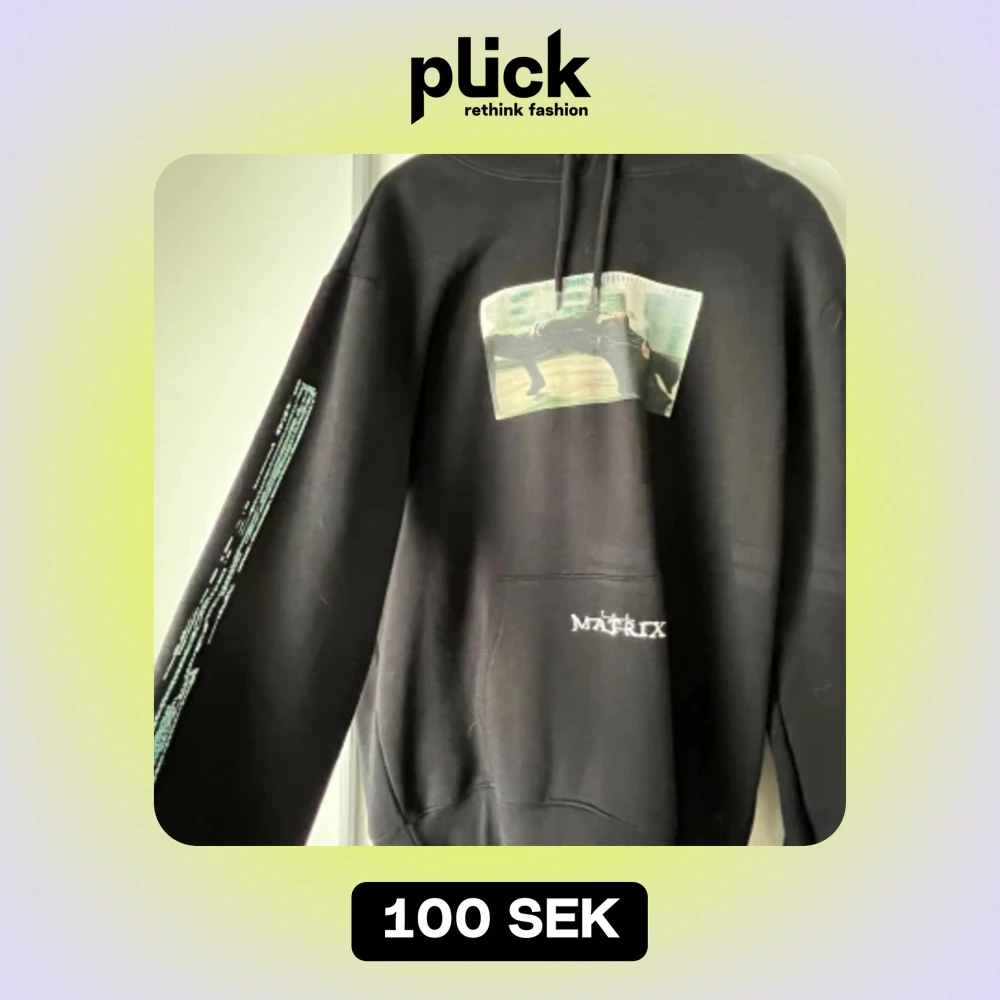 Säljer en svart hoodie från H&M med Matrix-tryck på framsidan och tryck längs ena ärmen. Den är i storlek XL men sitter som L