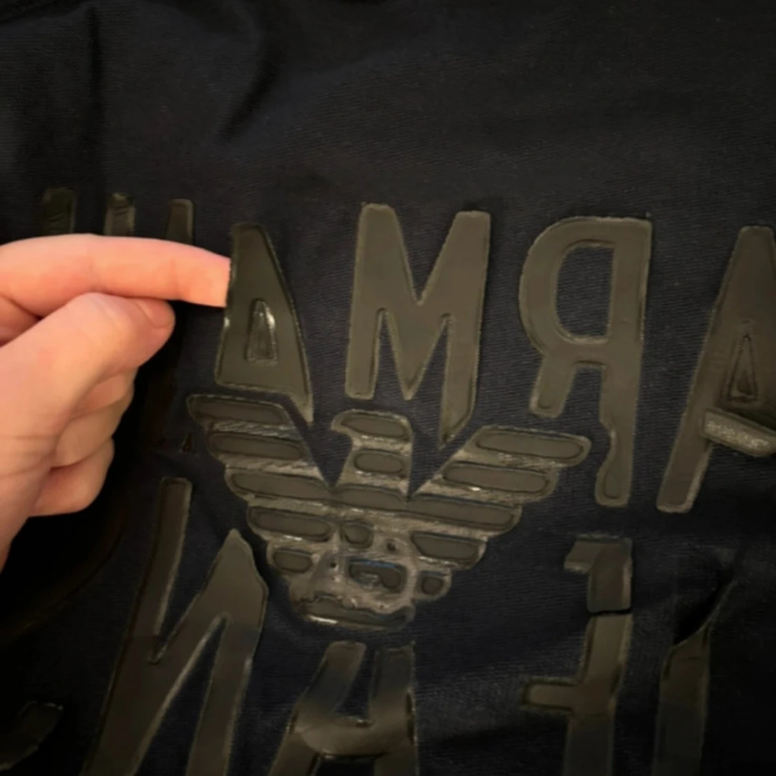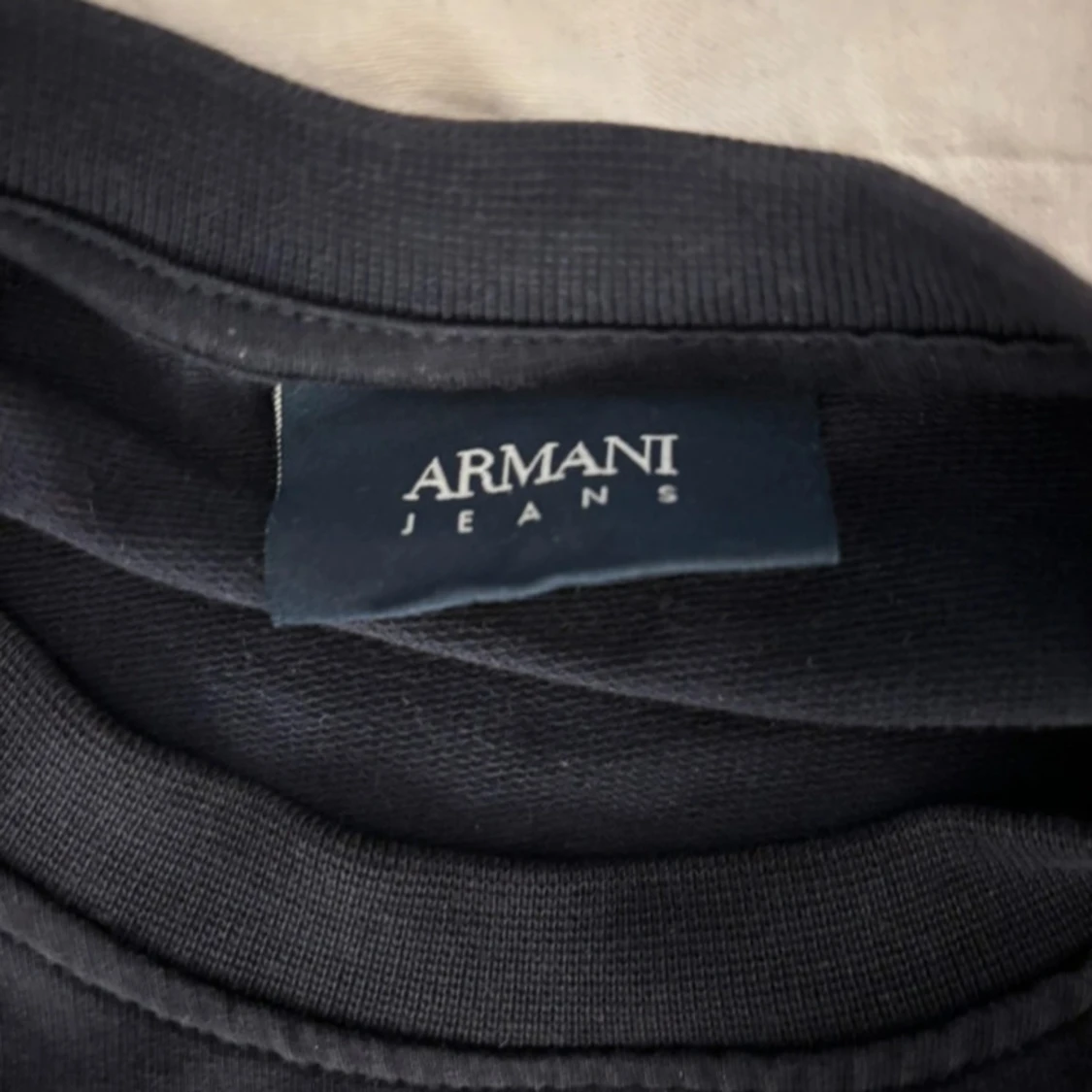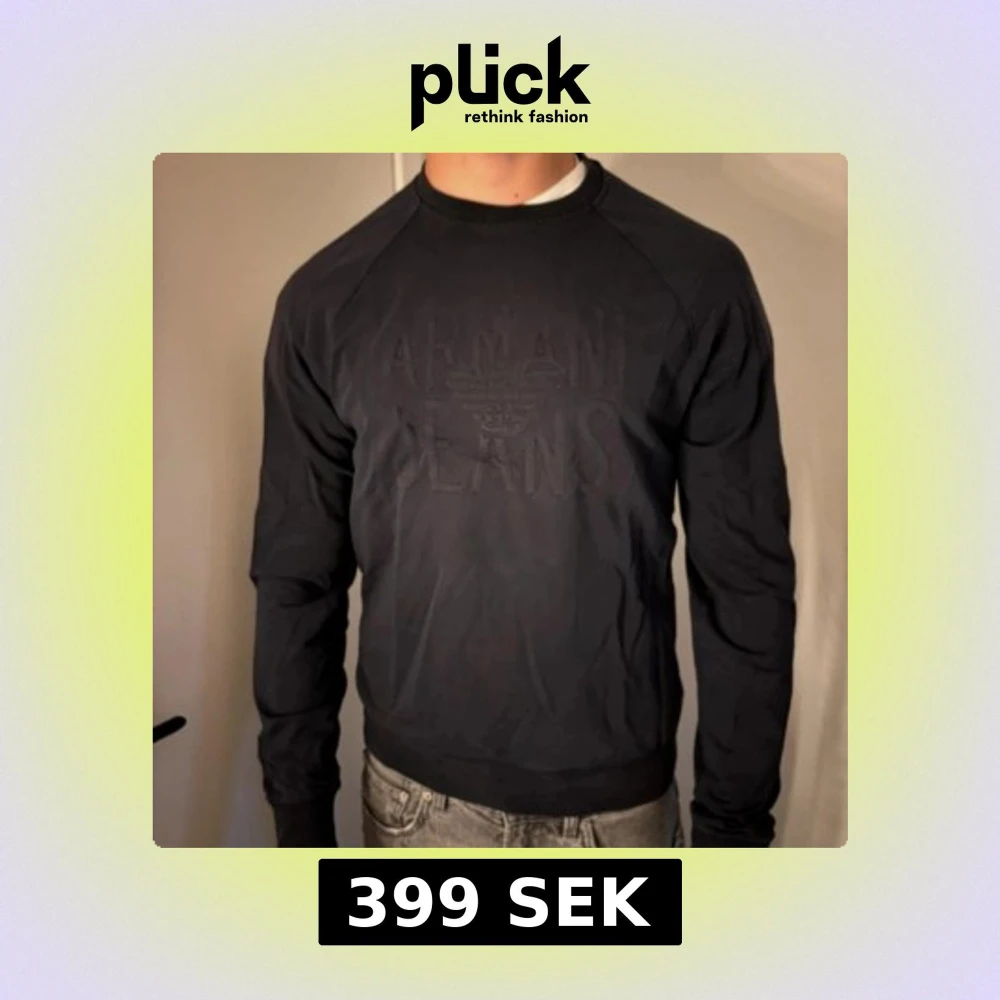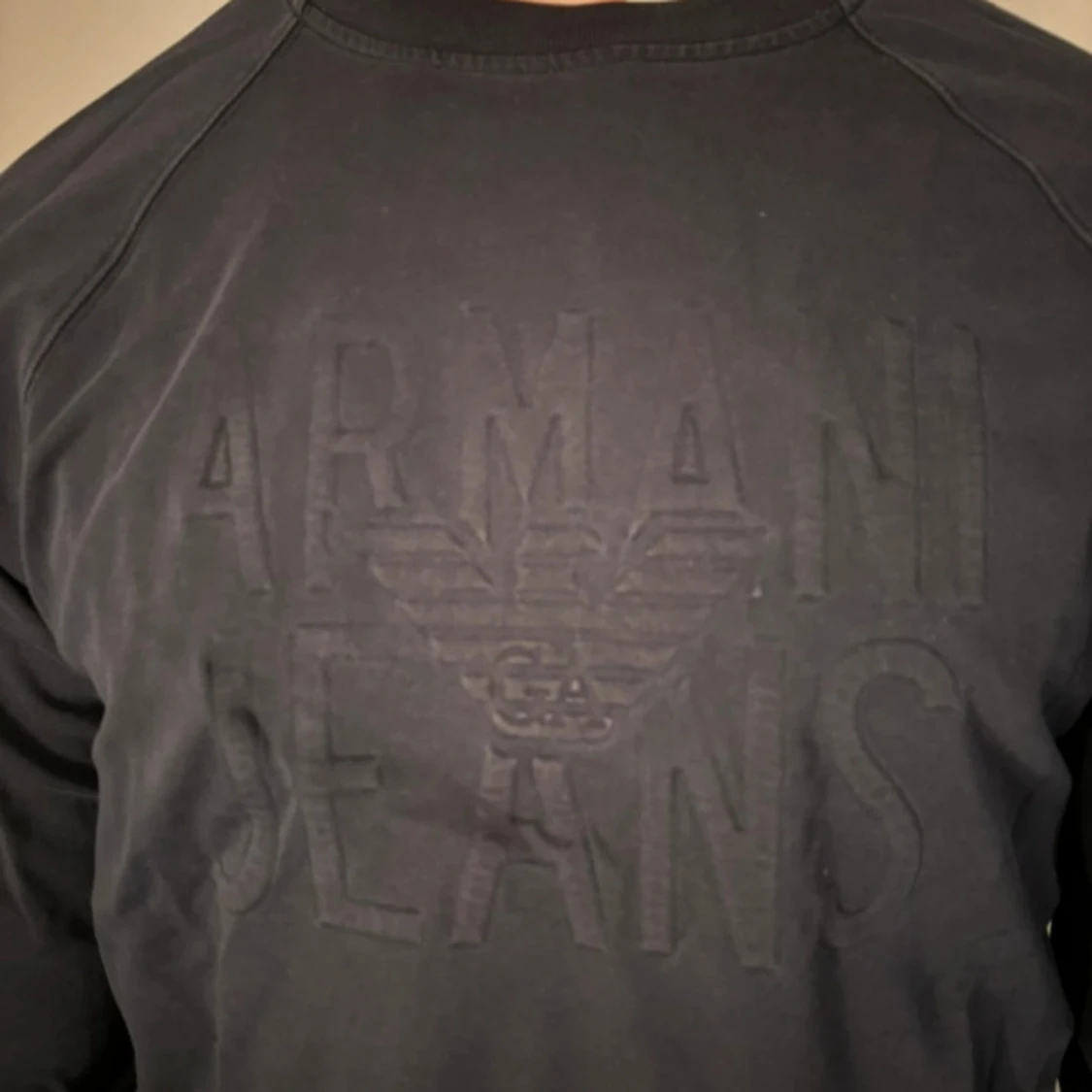 Snygg svart tröja från Armani Jeans med ett upphöjt logotyptryck på framsidan. Tröjan har långa ärmar och en klassisk rund halsringning. Perfekt för en stilren look. Nypris: ~1500. Mitt pris; 399.