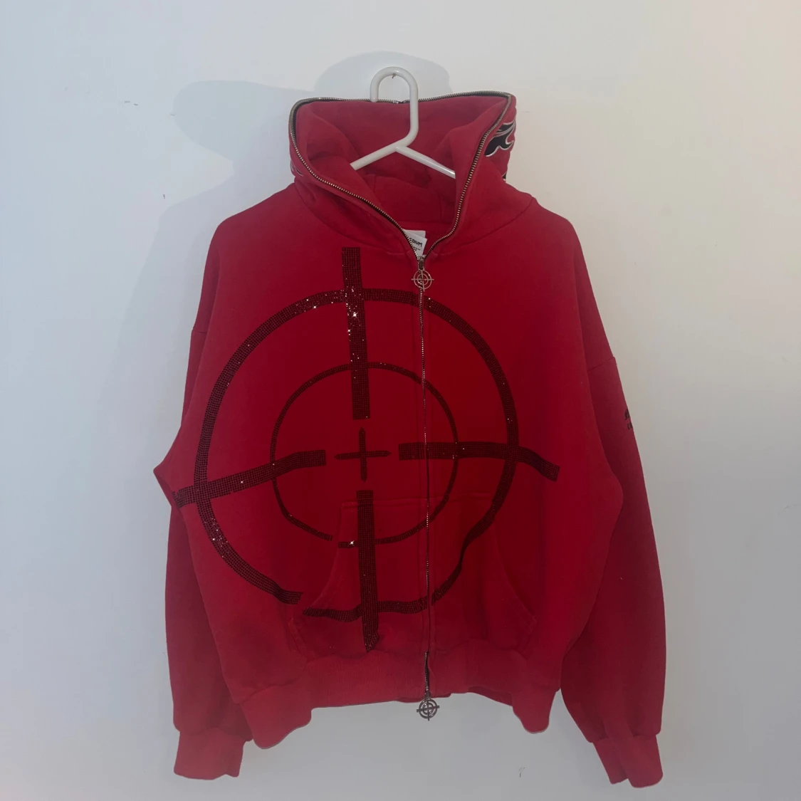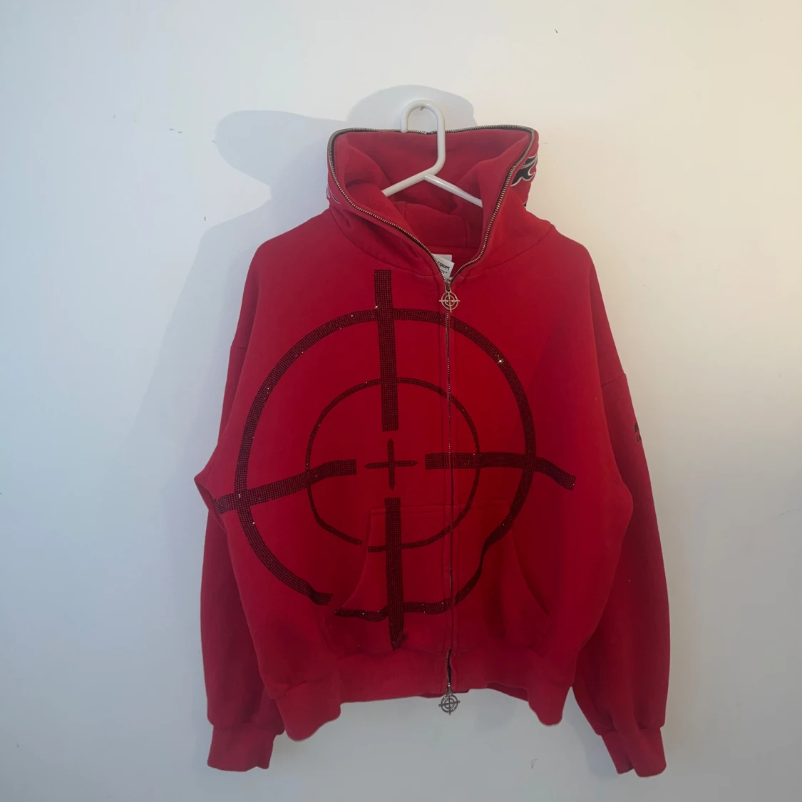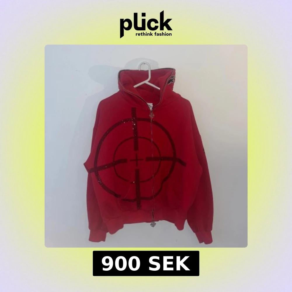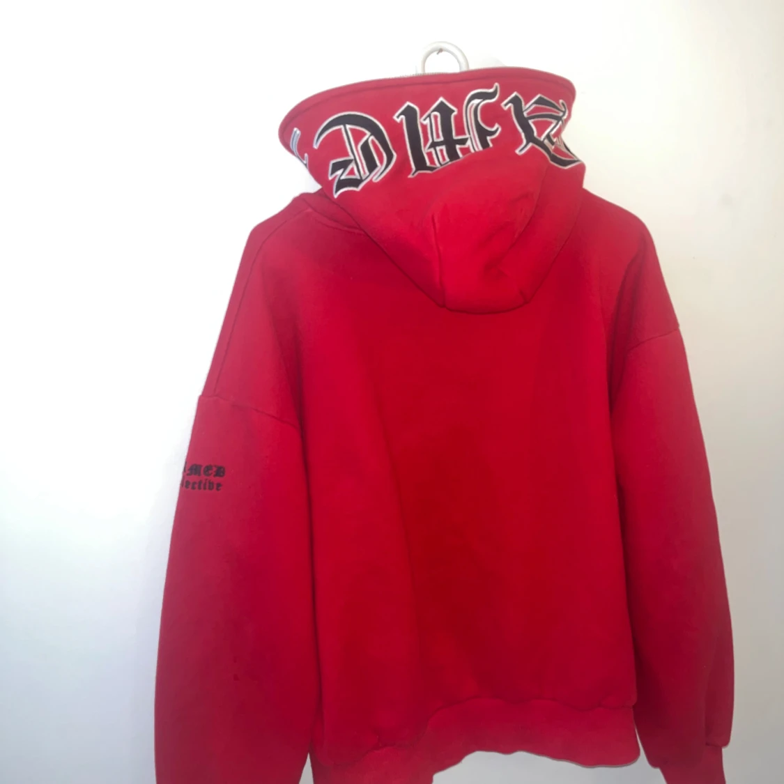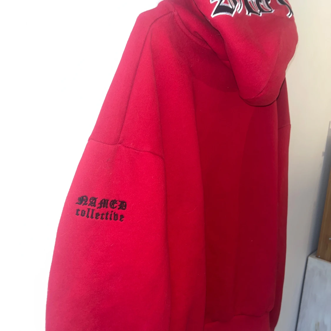 Säljer en cool röd hoodie från Named Collective med ett stort svart mönster framtill och text på huvan. Hoodien har dragkedja och långa ärmar, perfekt för en avslappnad stil. Skickas samma dag!