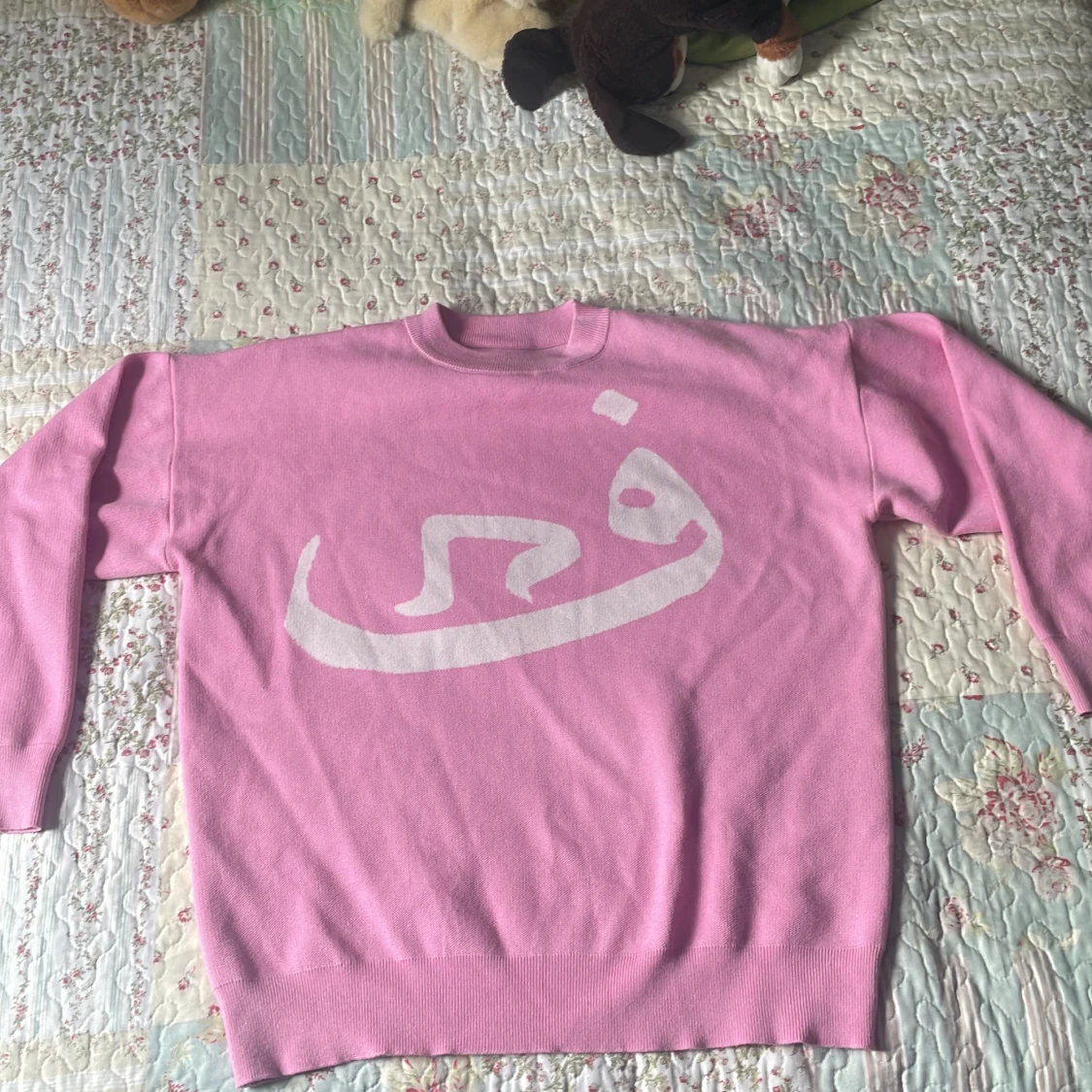 Säljer en rosa stickad tröja med vit print framtill i ett coolt grafiskt mönster. Tröjan har rund hals och långa ärmar, perfekt för dig som gillar färg och vill sticka ut. Mjuk och skön känsla, passar till jeans eller kjol.