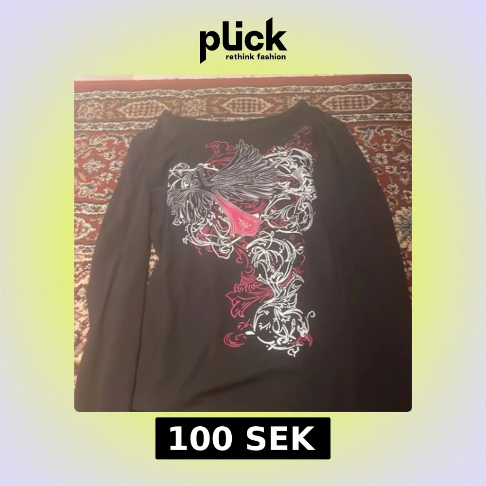 Snygg svart långärmad topp med ett detaljerat vitt och rött mönster framtill. Perfekt för att ge din outfit en unik touch.
