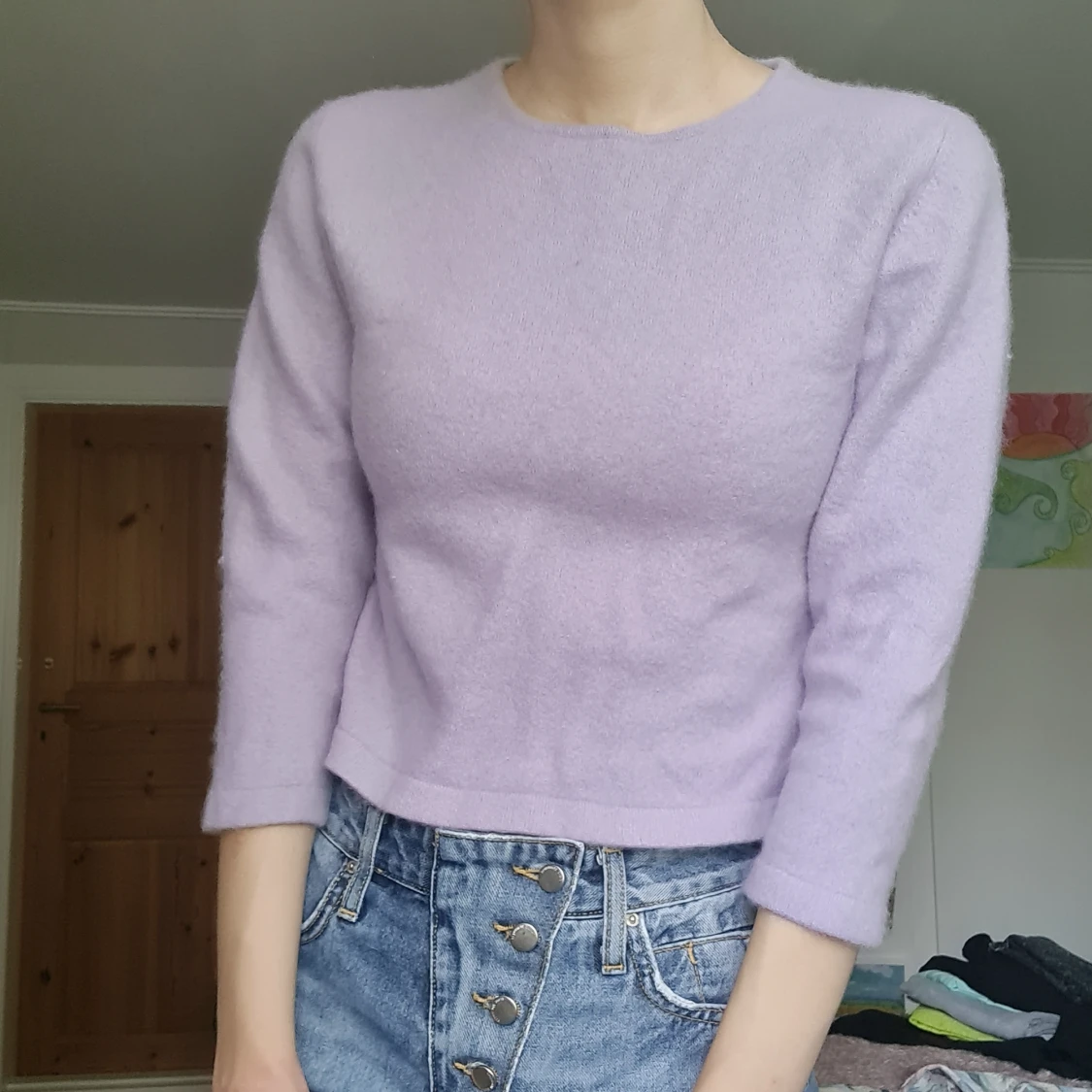 Ljuslila tröja i storlek S men som krympt i tvätten. Lite croppad med trekvartsärmar. väldigt mjuk och skön då den är i I 100% kashmir. Bra skick förutom små hål precis i armhålan som jag märkte först nu