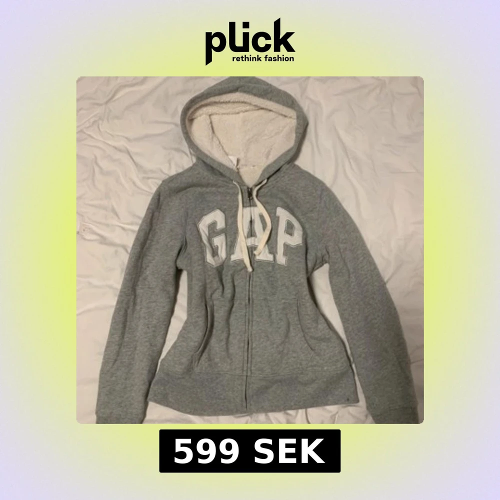 Mysig grå hoodie från GAP med dragkedja och vit text på bröstet. Den har en fodrad huva och snören för justering. Perfekt för kyliga dagar.