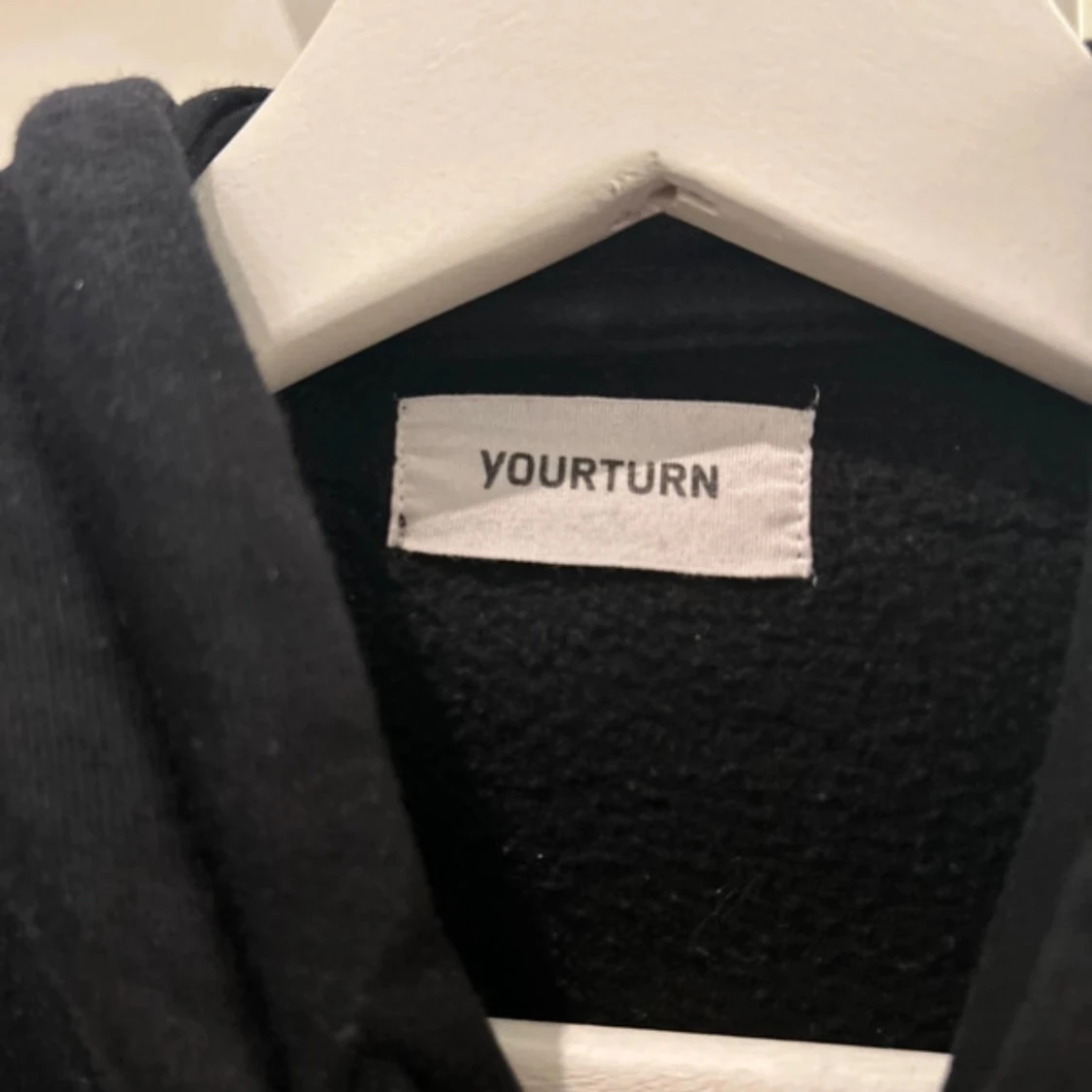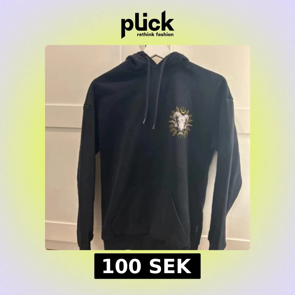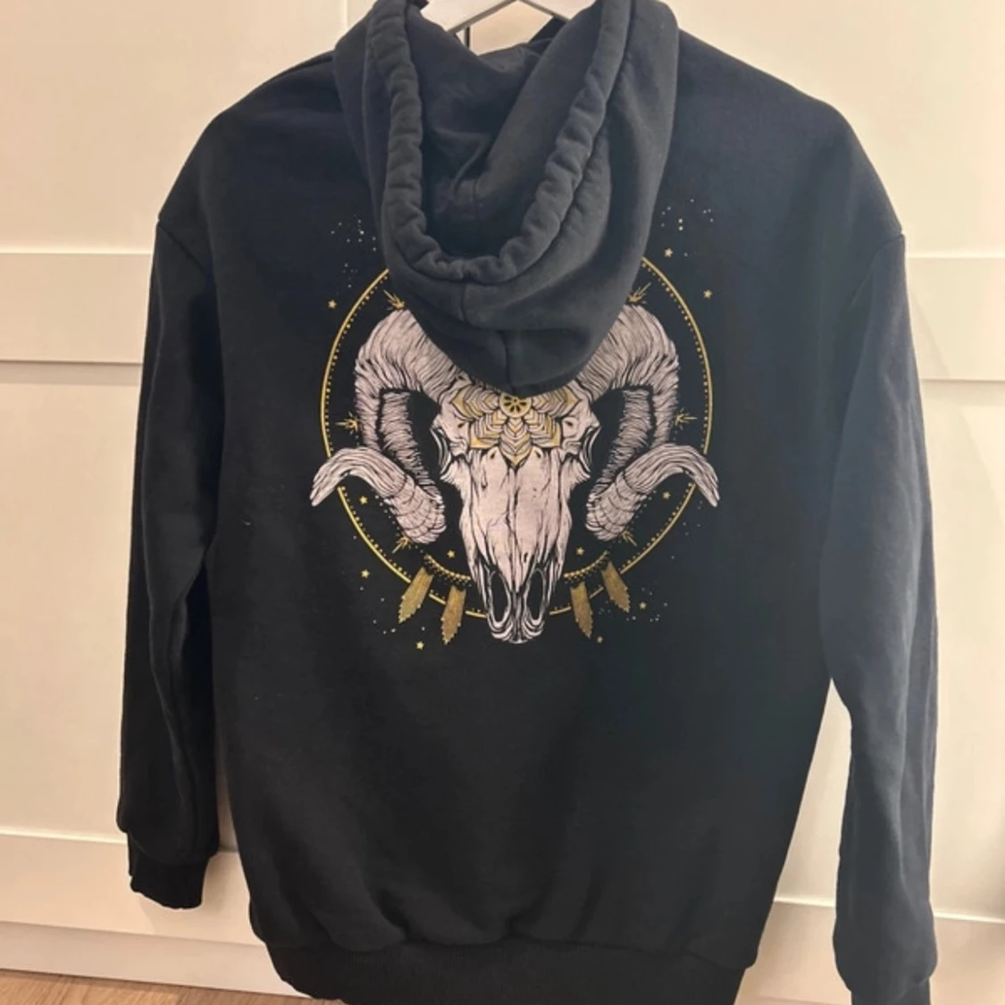 Säljer en svart hoodie från Yourturn med ett coolt tryck av en vädursskalle på ryggen och ett mindre tryck på bröstet. Tröjan har en klassisk känguruficka och justerbar huva med snören. Perfekt för en avslappnad stil.