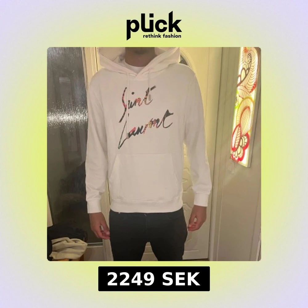 Säljer en stilren vit hoodie från Saint Laurent med färgglad logotyp på bröstet. Tröjan har en klassisk känguruficka och justerbar huva med snören. Perfekt för en avslappnad look. Modellen är 180 och väger cirka 65
