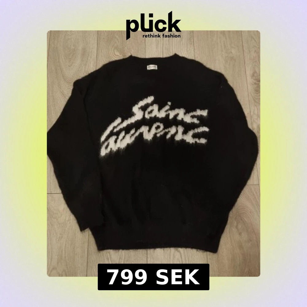 Svart stickad tröja från Saint Laurent med vit, suddig logotyp på bröstet. Tröjan har rund hals, ribbade muddar och lång ärm. Materialet är mjukt och fluffigt, troligen mohair eller ullblandning. Perfekt för dig som gillar exklusiva streetwear-vibbar.