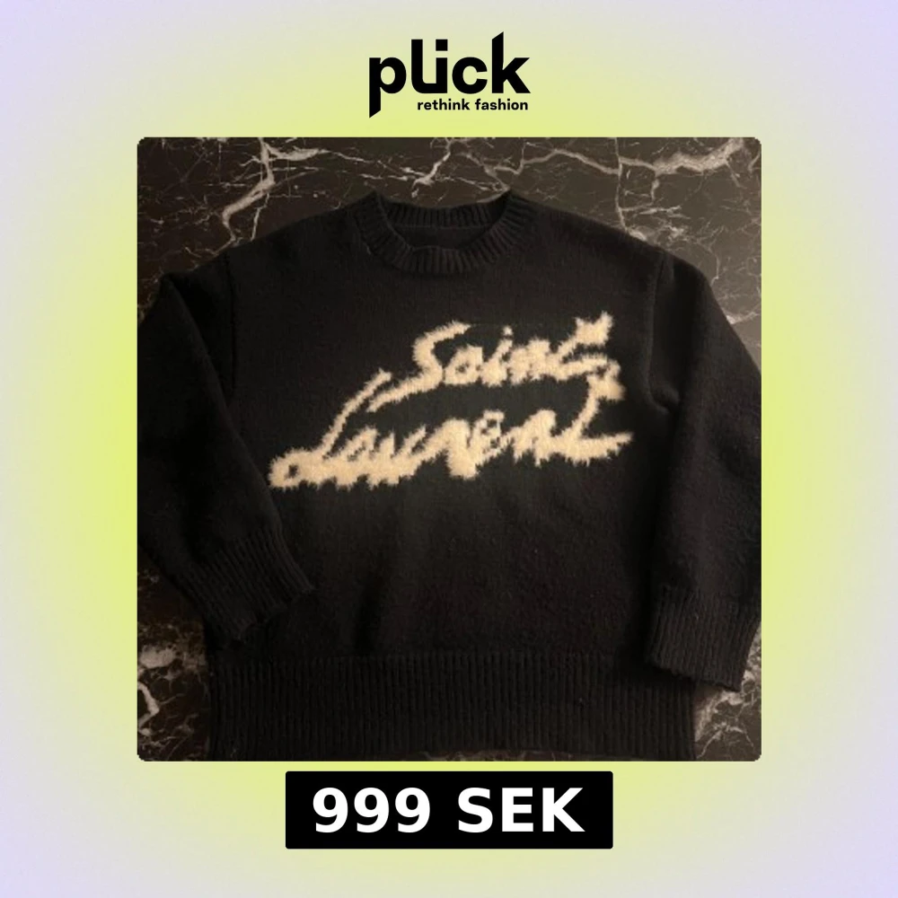 Säljer en svart stickad tröja från Saint Laurent med vit, fluffig logga framtill. Jag drog av tagen för den var jätte störig för en sånhär varm och skön tröja. Tröjan har rund hals, långa ärmar och breda ribbade muddar. Materialet är mjukt och värmande, perfekt för kyligare dagar. En statement piece för dig som gillar lyxiga märken.