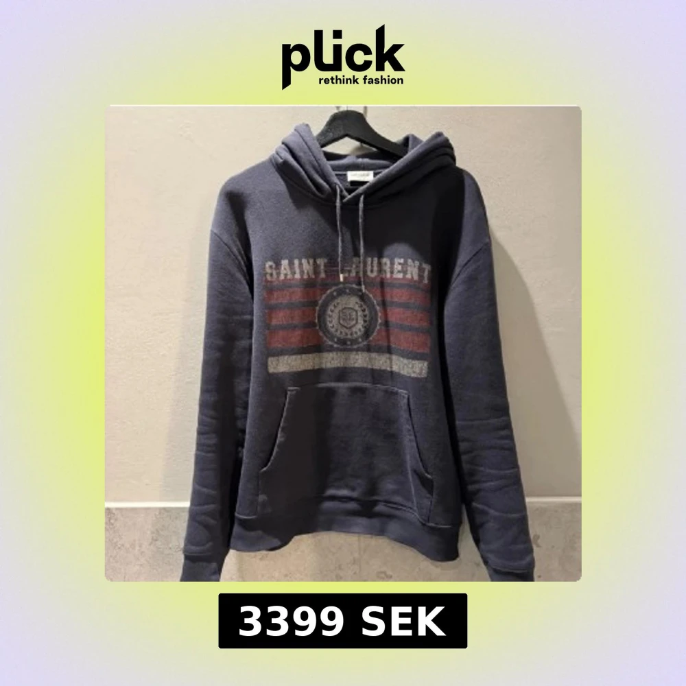 Snygg mörkblå hoodie från Saint Laurent med tryck i vitt och rött framtill. Tröjan har huva med snörning, känguruficka och långa ärmar. Materialet är mjukt och skönt, perfekt för chill dagar. Klassisk streetstil med coolt vintageinspirerat tryck.