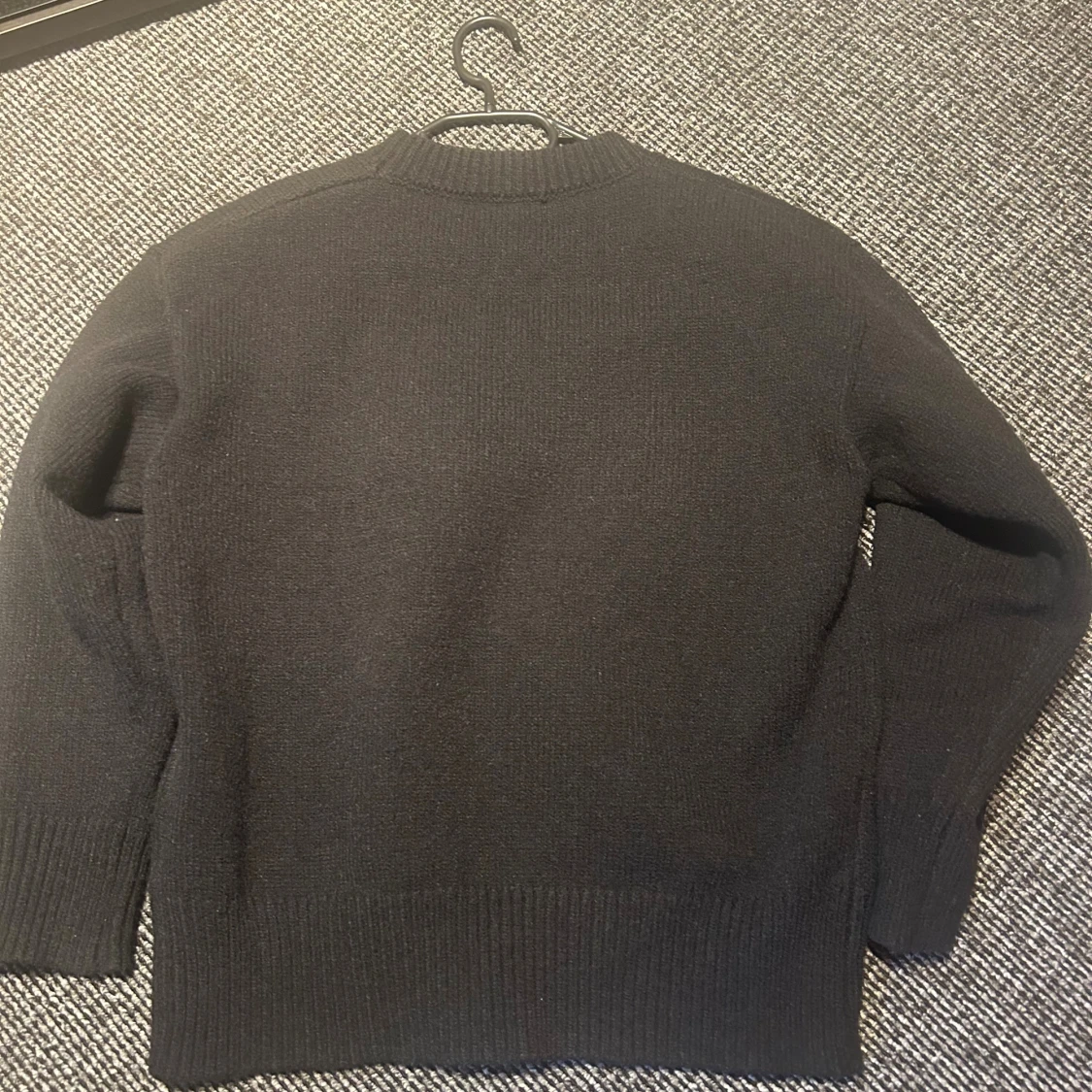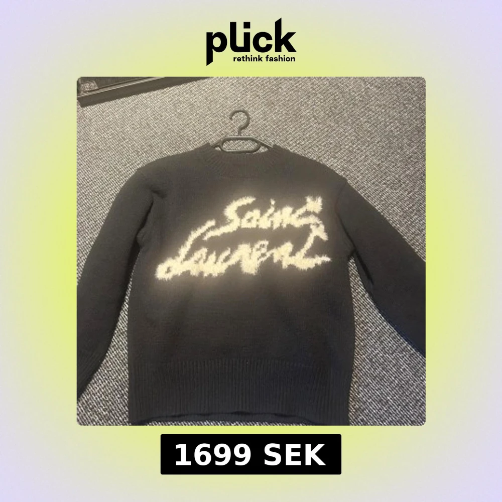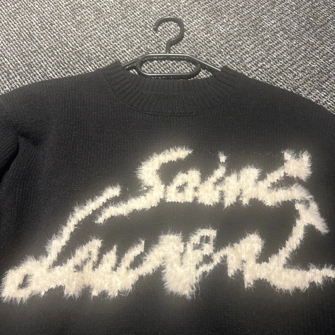 Svart stickad tröja från Saint Laurent med fluffigt vitt logotyptryck på bröstet. Rund hals och långa ärmar med ribbade muddar. Perfekt för dig som vill ha en cool statement piece med lyxig vibe och unik design.