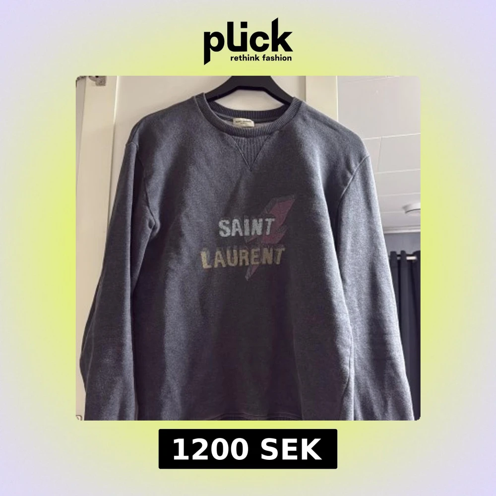 Säljer en grå sweatshirt från Saint Laurent med coolt vintage-tryck framtill i pastellfärger och en blixtdetalj. Tröjan har rund hals, ribbade muddar och lång ärm. Perfekt för dig som gillar streetstyle och designer vibes.