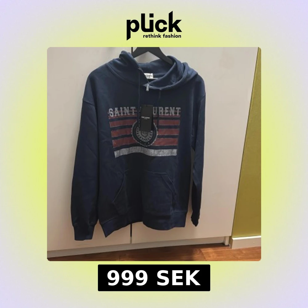 Säljer en mörkblå hoodie från Saint Laurent med tryckt logga och ränder i rött och vitt på bröstet. Tröjan har huva med snörning och en stor magficka. Perfekt för dig som gillar streetstyle och vill ha något snyggt och bekvämt.