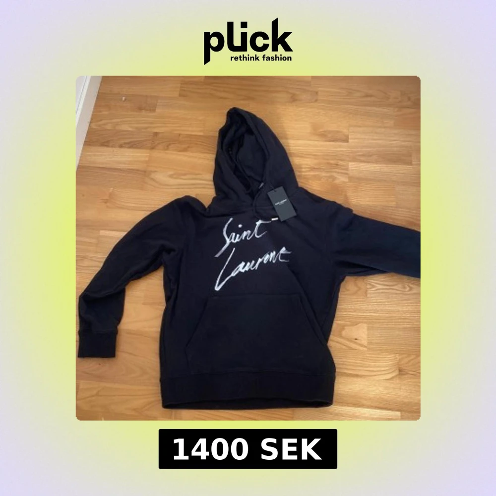 Säljer en svart hoodie från Saint Laurent med vit logga i handskriven stil på bröstet. Tröjan har huva med dragsko och en stor magficka. Perfekt för dig som gillar exklusiva streetwear-plagg. Aldrig använd