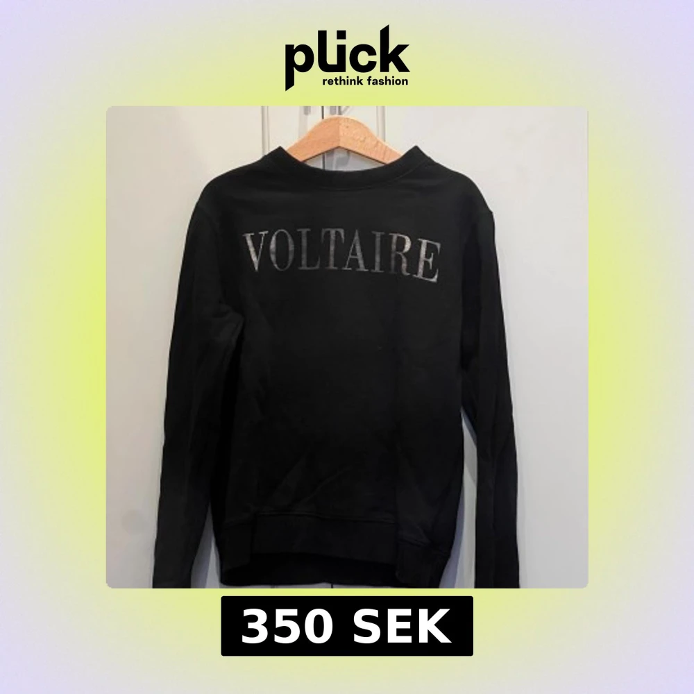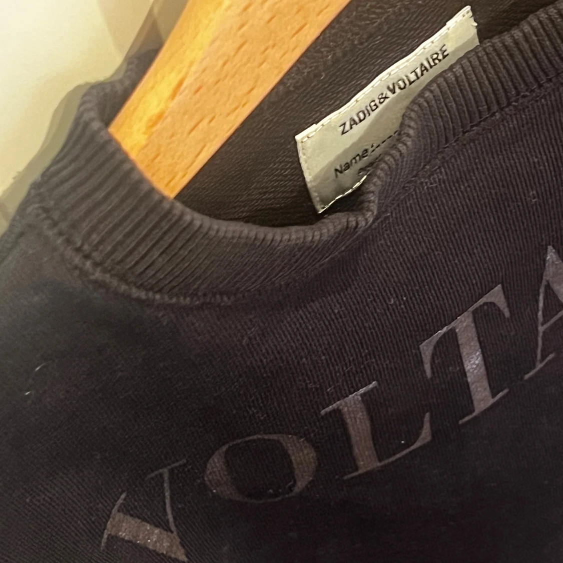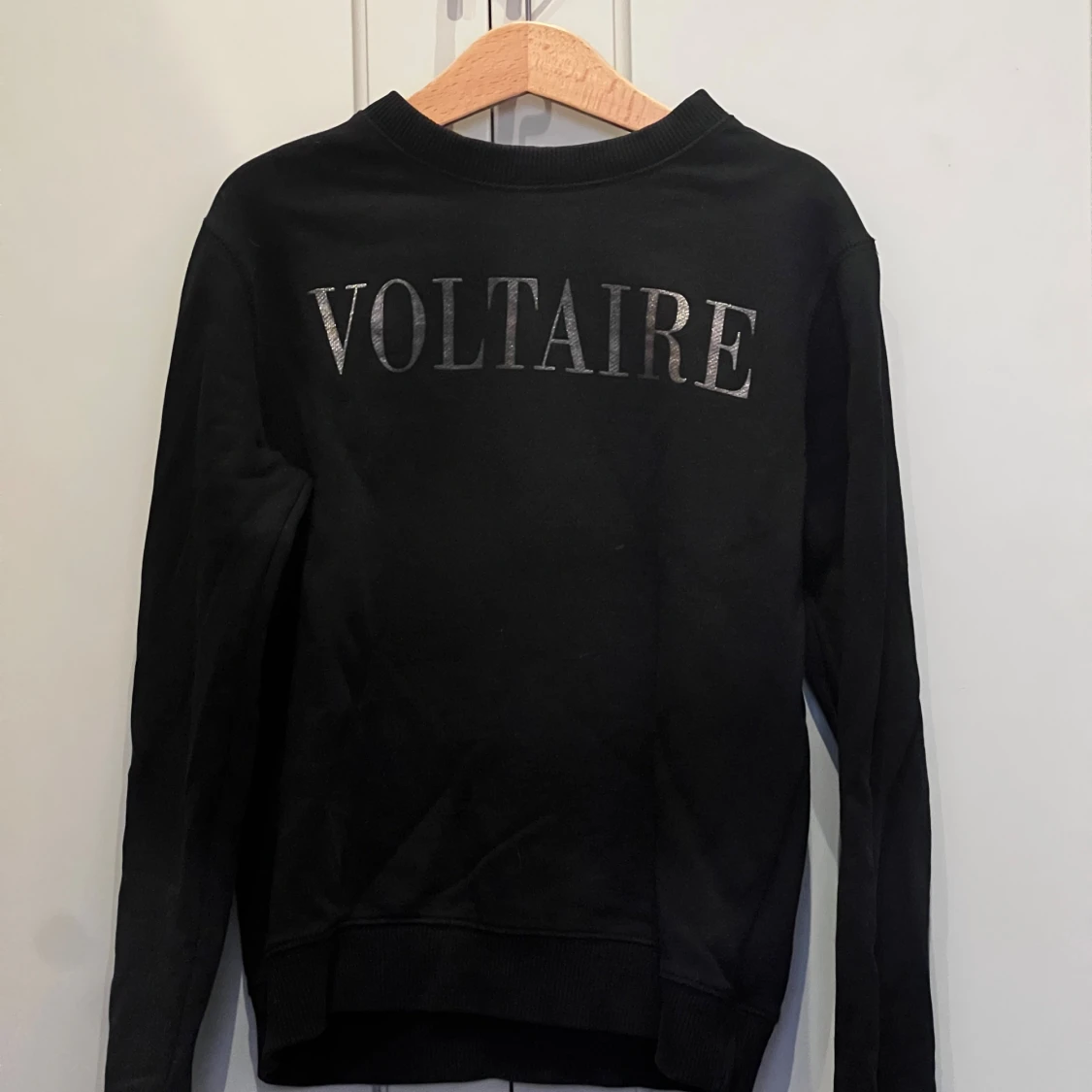 Cool svart sweatshirt från Zadig & Voltaire med silvrigt tryck VOLTAIRE på ryggen. Klassisk rund halsringning och långa ärmar. Perfekt för dig som gillar stilrena och trendiga plagg med en touch av streetstyle.