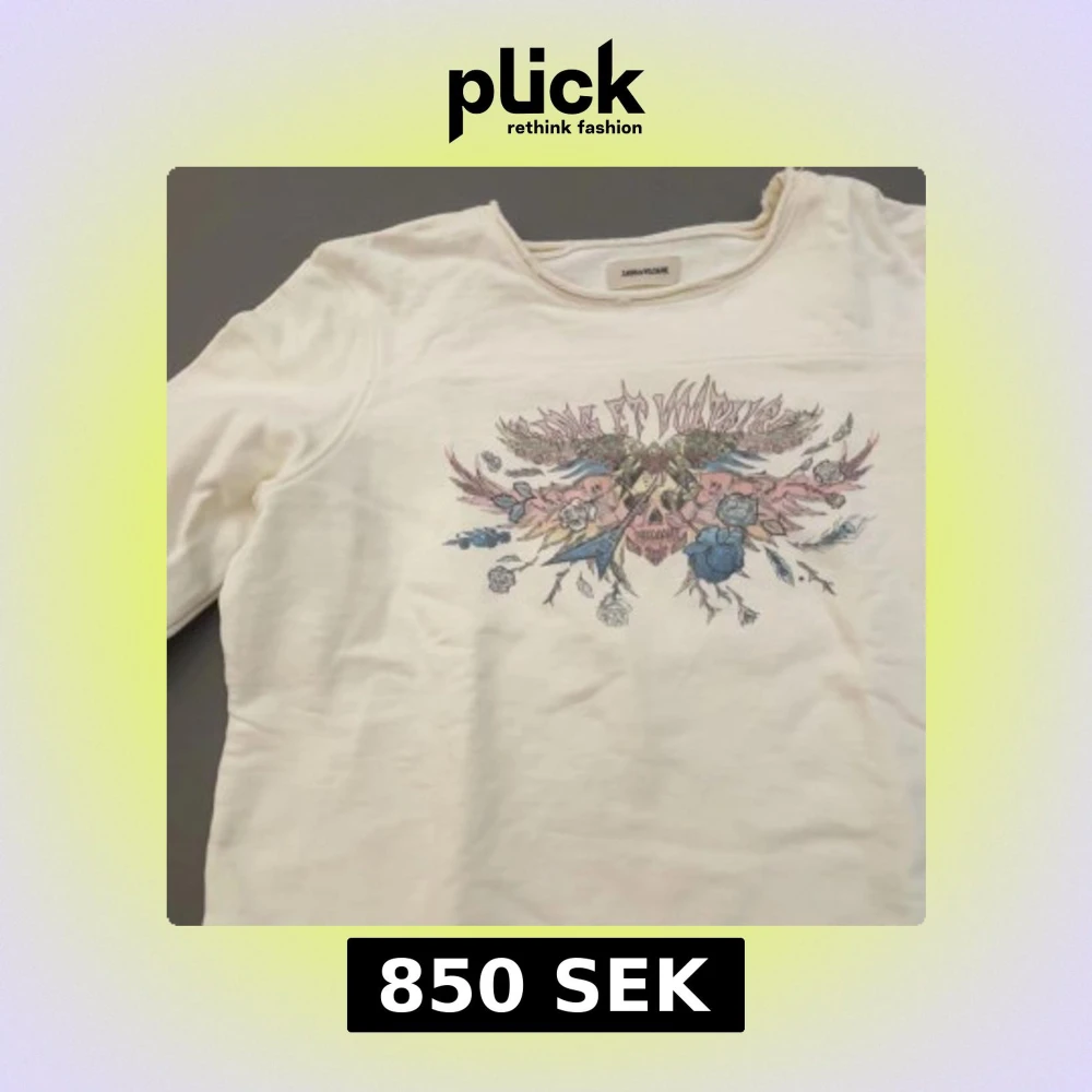 Säljer en vit långärmad tröja från Zadig & Voltaire som orginelt kostar 1250 med coolt tryck framtill i rosa, blått och beige. Trycket har blommor, döskalle och vingar som ger en edgy vibe. Tröjan har rund hals och är gjord i mjuk bomull. Perfekt för dig som gillar statement-plagg! Som är liten i storleken är lite liten för mig och jag är 13 år🩷