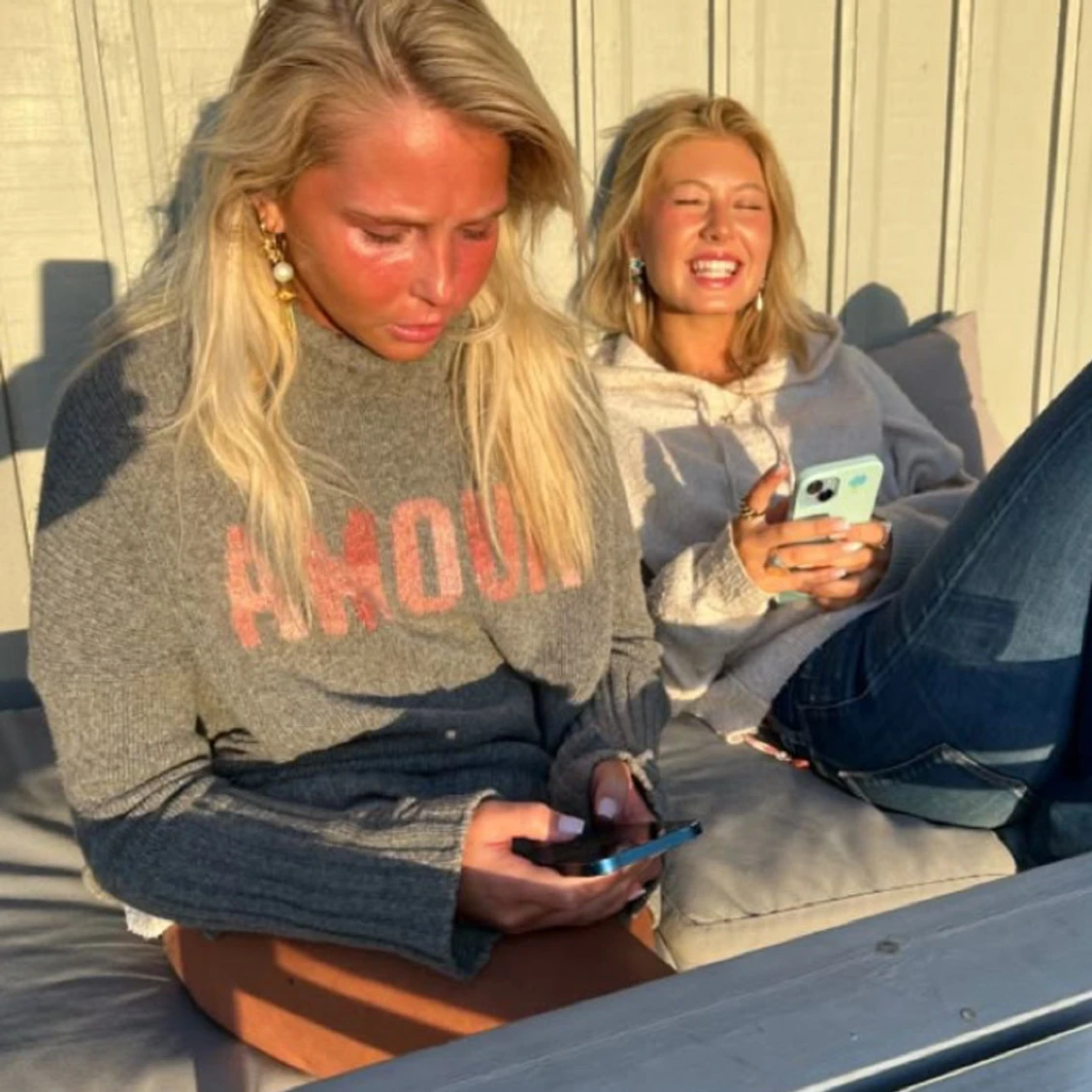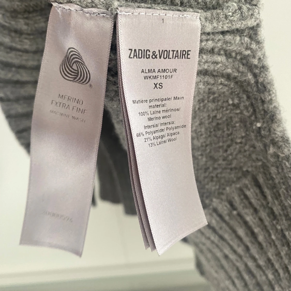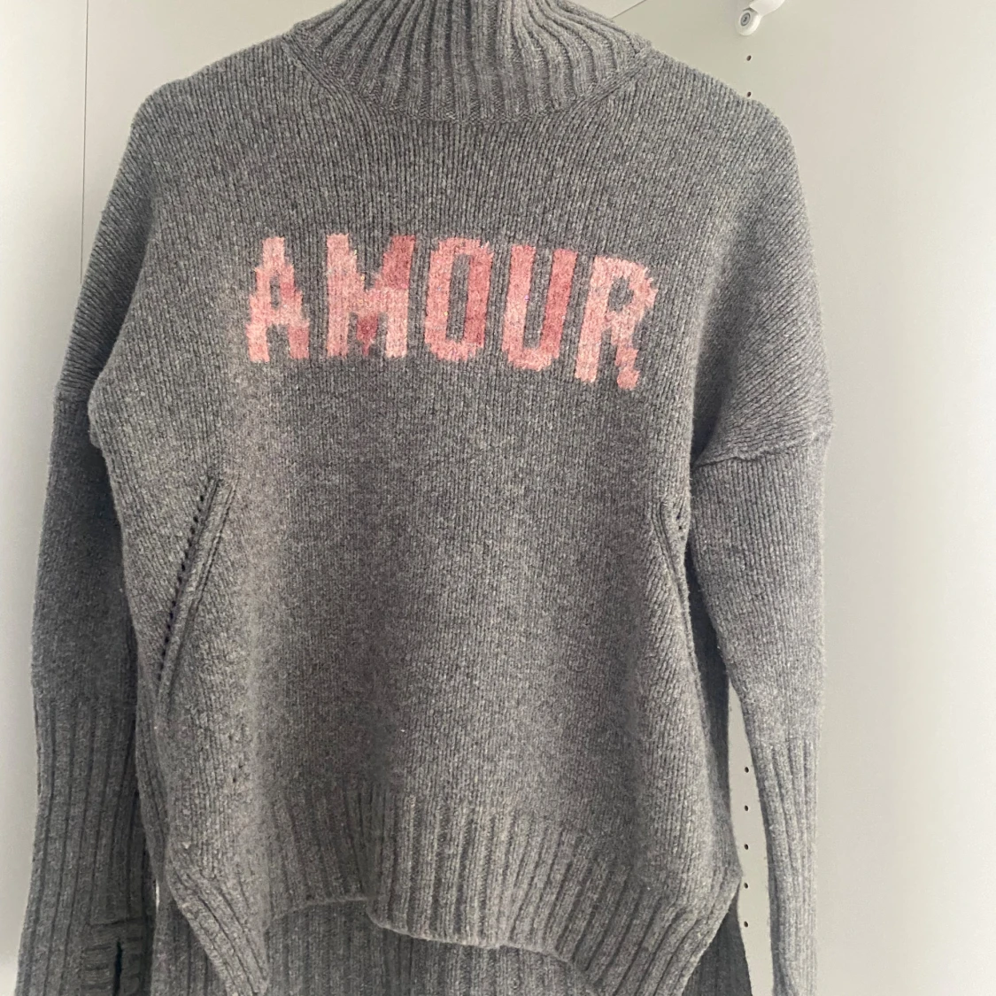 Supermysig grå stickad polotröja från Zadig & Voltaire med rosa texten 'AMOUR' framtill. Gjord i merinoull, alpacka och polyamid för extra mjuk känsla. Perfekt för kyliga dagar. Storlek xs , väldigt fint skick bara använd några enstaka gånger för året 🫶🏻 är öppen för prisförslag !❣️❣️