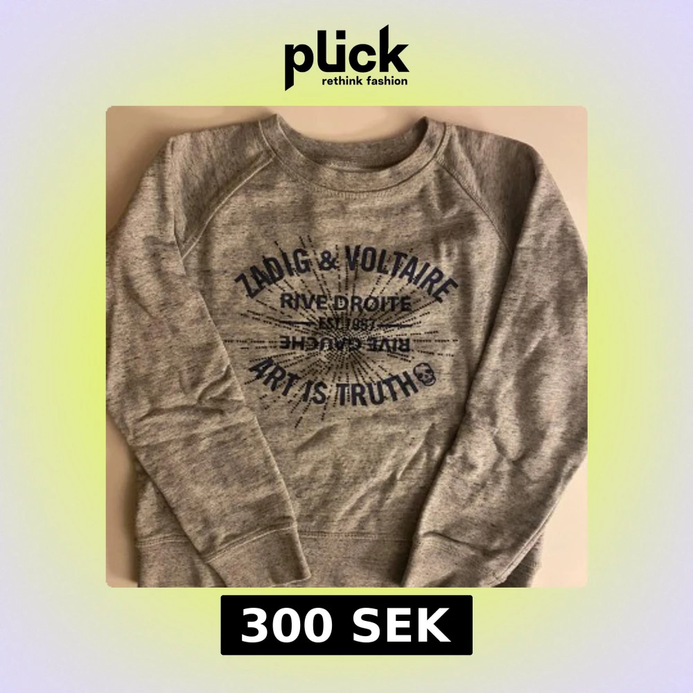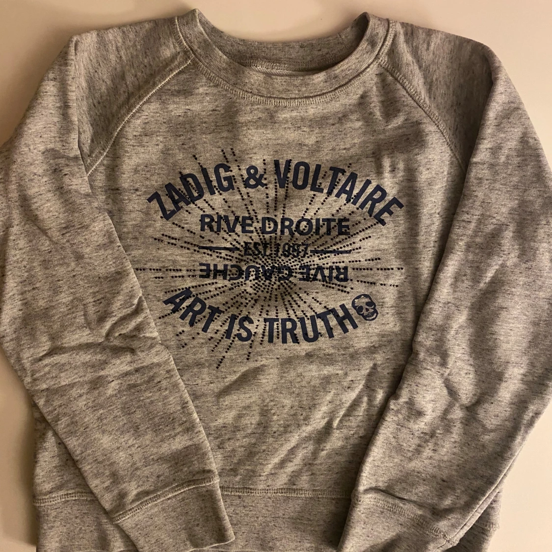 Snygg grå sweatshirt från Zadig & Voltaire med blått tryck framtill där det står 'Art is Truth'. Tröjan har rund halsringning, långa ärmar och mjuk bomullskänsla. Perfekt för en avslappnad och cool stil. BARN STORLEK ÅR 10 ÅR