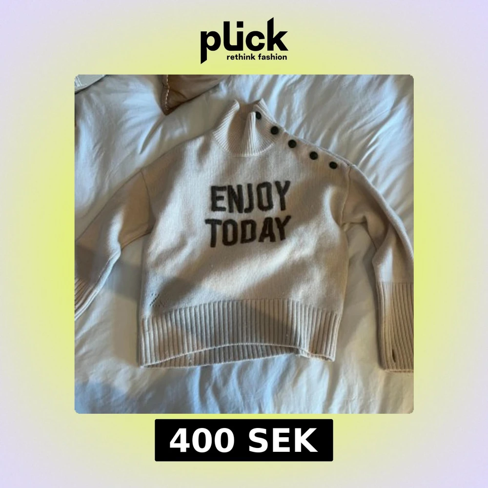 Säljer en beige stickad polotröja från Zadig & Voltaire med texten 'ENJOY TODAY' framtill. Tröjan har hög krage, knappar på axeln och breda ribbade muddar vid ärmslut och nederkant. Perfekt en sommarkväll.