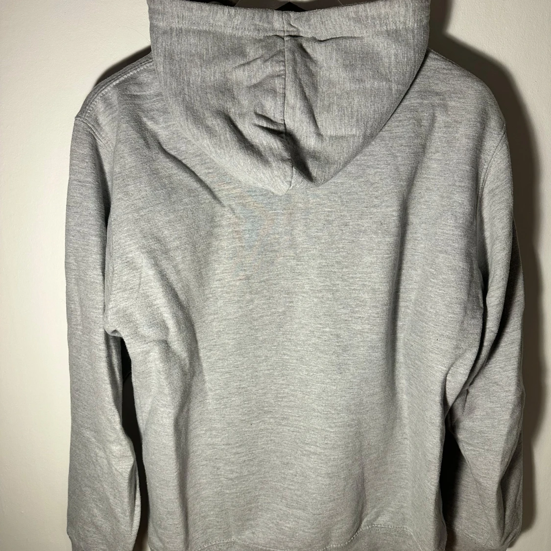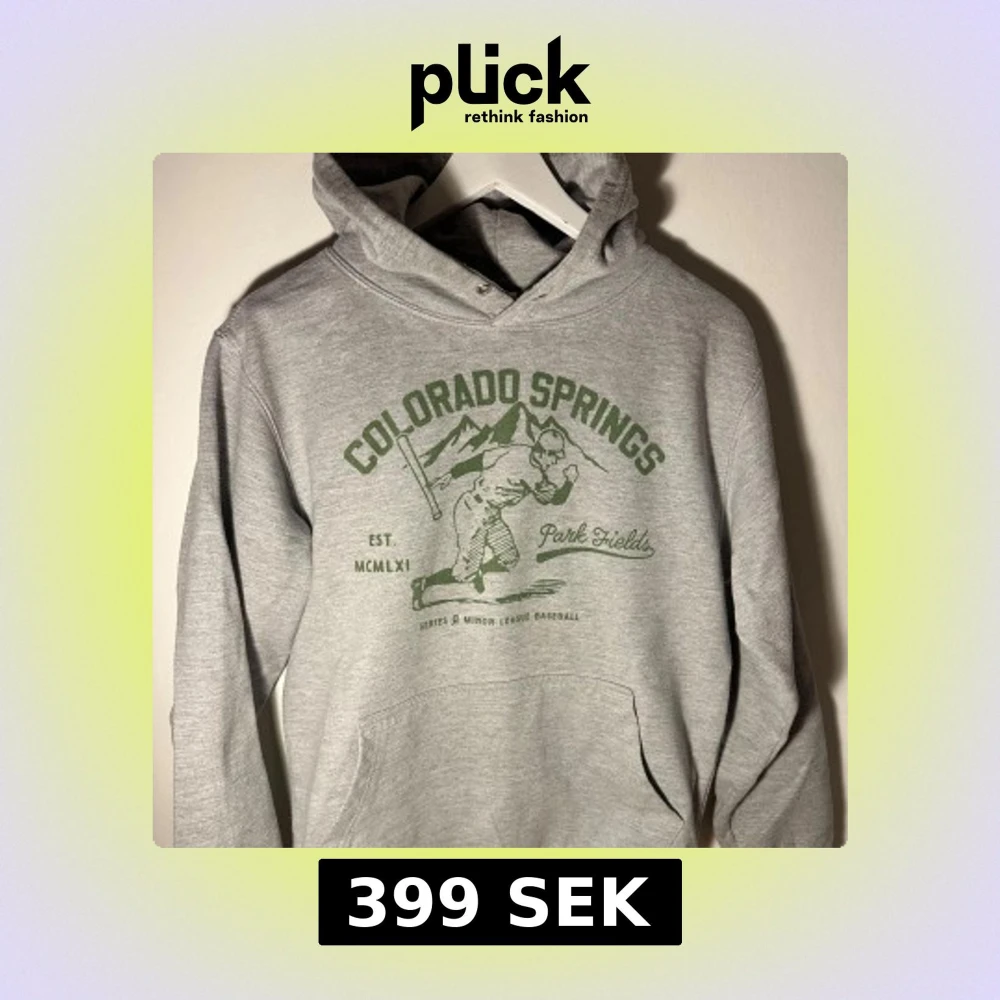 Säljer en grå hoodie med tryck av 'Colorado Springs' och en baseballspelare i grönt. Tröjan har en klassisk känguruficka och en bekväm huva. Perfekt för en avslappnad stil.